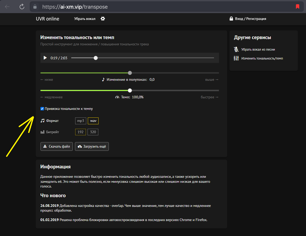 >>3557857 >Не нашел твою музыку. Скинь ссылку на ютубунити. Наверняка ты находил оригинал: BIA — CAN'T TOUCH THIS. А ускоренную версию ты не нашёл потому что музыку я ускоряю сам. На сервисе что на втором пике (НЕ РЕКЛАМА!) адрес там на скрине есть. Так что взяв оригинал ты сам можешь ускорить и получить ту версию что в видео. Параметры: Темп: 111,3%, Тон 1,85 ед. (Только обязательно поставь галочку отмеченную стрелочкой. Что бы не было щелчков и ненужных искажений). Если с помощью этого сервиса парится тебе особо не хочется то я сделал релейд 3 с полной ускоренной версией. Пожатие там нормальное так что можешь просто выдрать из неё трек в любом аудио формате с помощью любого онлайн сервиса "Извлечь музыку из видео". (Так то я сначала просто хотел перекодировать в mp3, закинуть на какой нибудь файлообменник и скинуть ссылку, но потом вспомнил поговорку "Гораздо лучше не дать анону рдну рыбу а показать как он сам сможет заполучить столько рыбы сколько ему надобно". Добра.