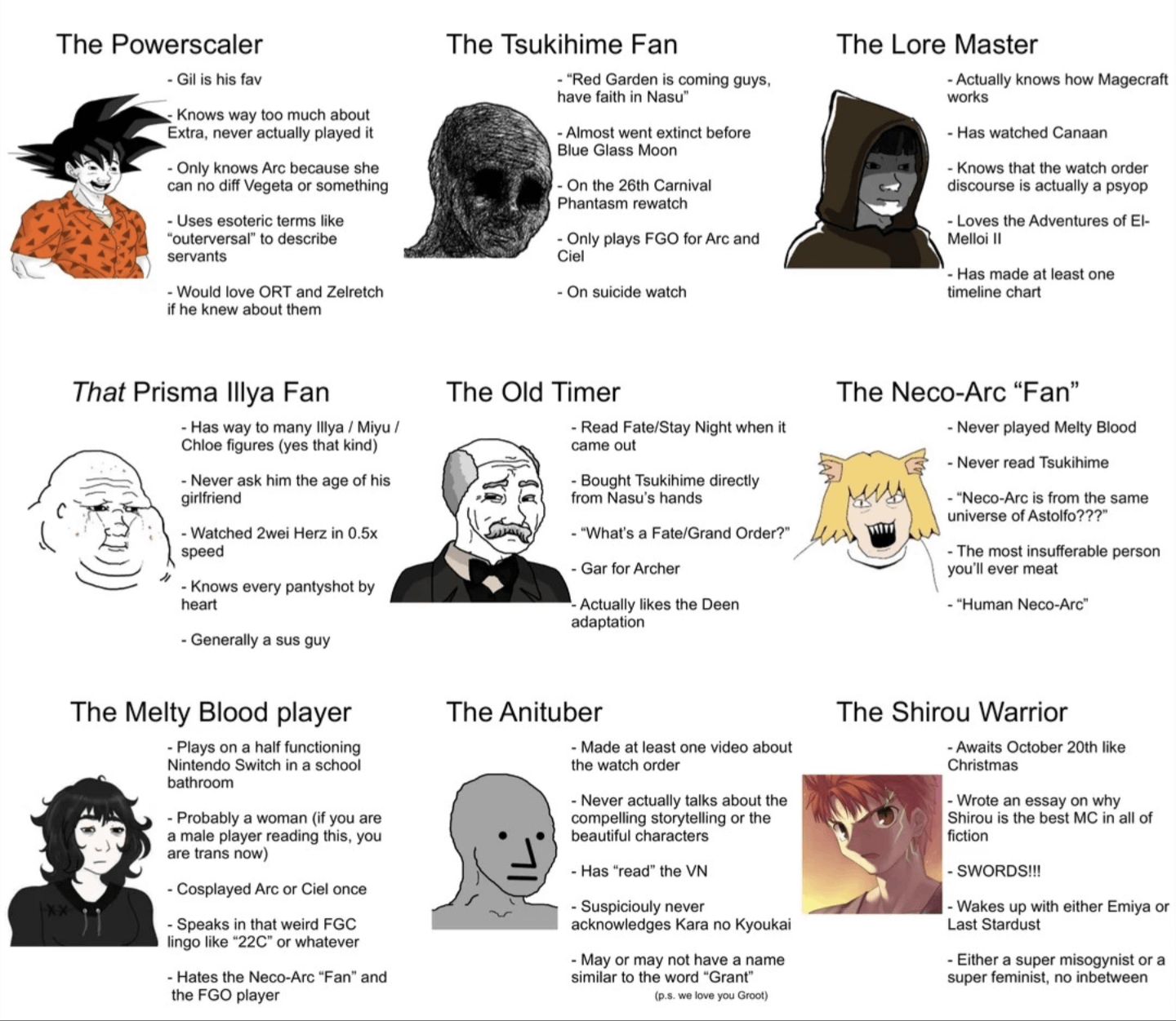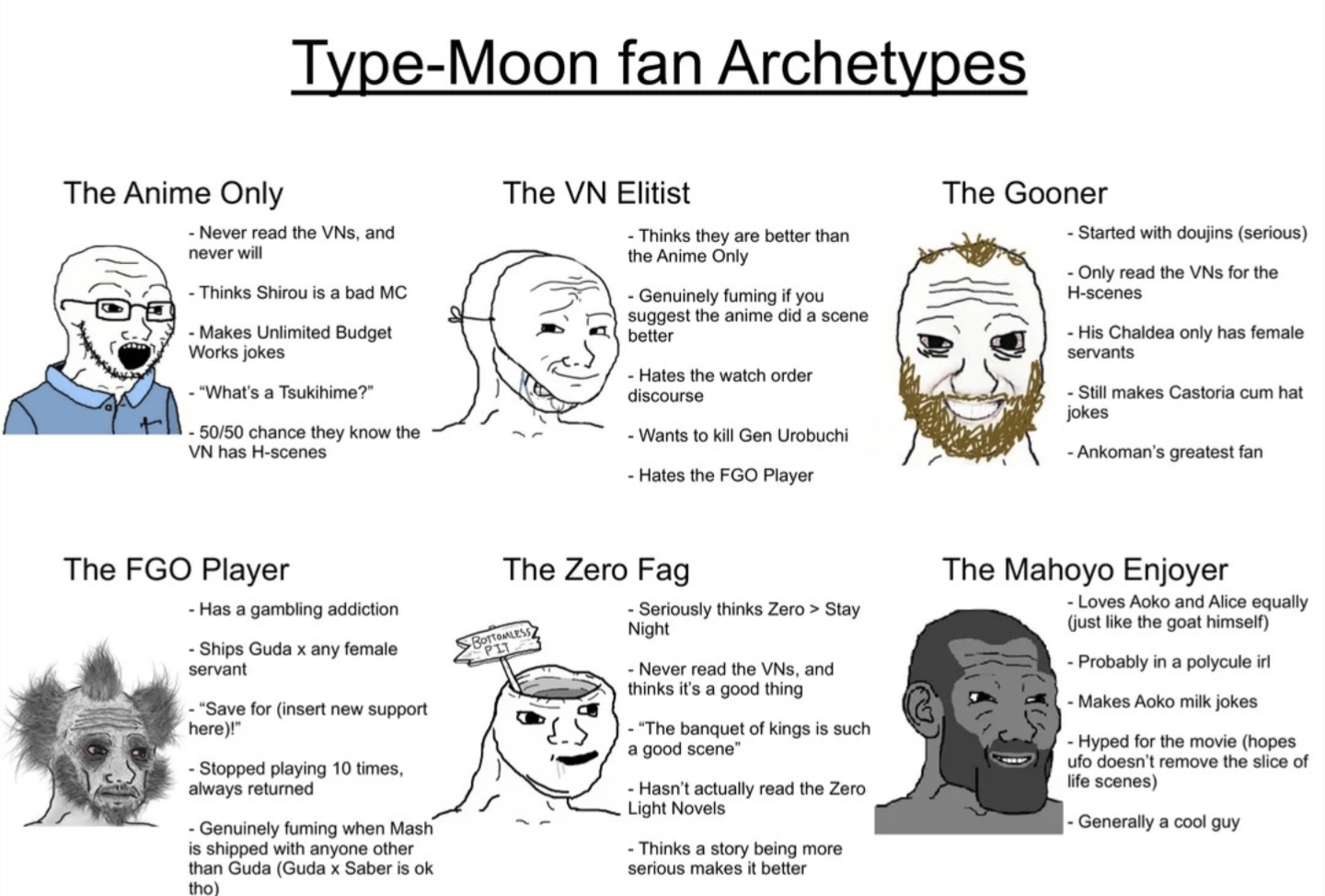 >>3802083 Если есть слишком много сладкого то эффект нивелируется... Это как с кофе или энергетиками сначала норм бодрит с одной банки а потом чтобы встать с кровати тебе требуется 4 >>3802086 Посмотрим....... >>3802088 Вкатываешься в фсн (либо сериал и фильмы по рутам, сначала убв, в последнюю очередь хф; но лучше новелла), потом читаешь холлоу атараксию смотришь зеро и готово. Остальную фейтоту (экстраверс, прототип, апокрифа, тайп редлайн, эльмеллой, призма иллия и тд) можно в произвольном порядке в целом. А карнавальный фантазм и фго то уже для преисполнившихся