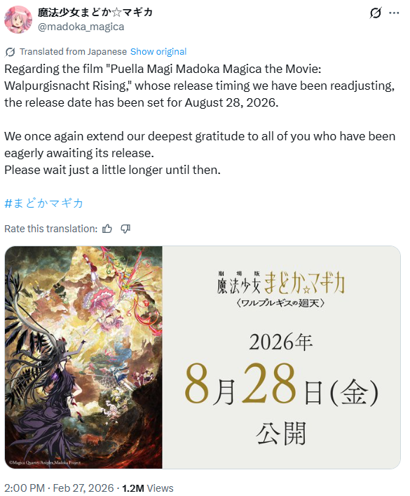 Хронология выхода: 06.01.11 - Начало сериала. 21.04.11 - Конец сериала. 06.10.12 - Премьера фильма "Beginnings" (кинокомпиляция 1-8 эпизода сериала). 13.10.12 - Премьера фильма "Eternal" (кинокомпиляция 9-12 эпизода сериала). 26.10.13 - Премьера полнометражного продолжения "Rebellion". 05.01.20 - Начало Magia Record(спин-офф). 25.04.21 - Анонс полнометражного продолжения "Walpurgis no Kaiten" 01.08.21 - Начало Magia Record season 2. 03.04.22 - Трансляция Magia Record Final Season.