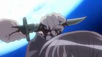 Если Асакура решила убить Кёна самостоятельно - она могла сделать это очень быстро, не вводя его в курс дела. Даже озвучил свои намеренья, Асакура не стала сразу парализовать Кёна, дала ему возможность уклоняться и почувствовать угрозу. Нож ей не нужен, блокировать инфопотоки в комнате не обязательно: подошла со спины, молча втащила со всей силы по затылку и все. Еще Асакура могла наколдовать огнестрел, какой-нибудь FMG-9 - компактный и смертоносный. И все же, Асакура использовала нож. Нож - это символ намеренья убить. Кстати, нож совершенно не похож на кухонный - он с гардой и зубцами на обухе - боевой нож, как у Рэмбо. Кён просто не воспринял бы всерьез угрозу от безоружной школьницы. Огнестрельное оружие он мог бы принять за игрушку. Нож - это максимально доходчиво.