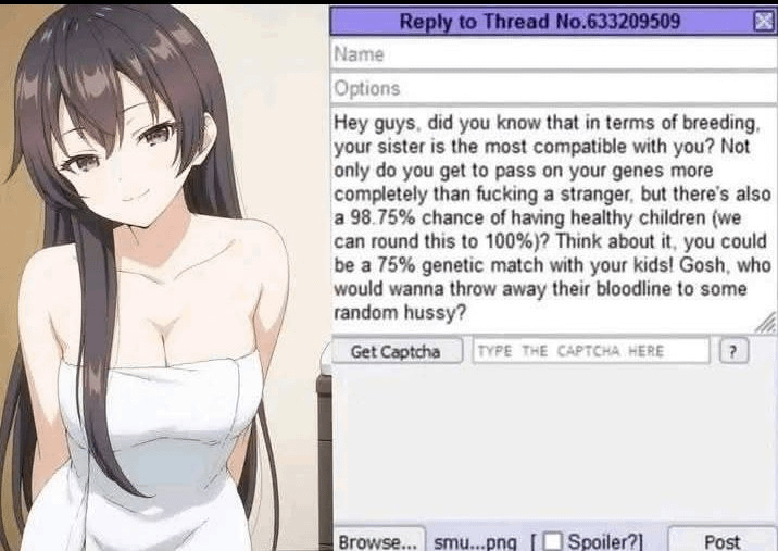 >>7906858 >Кровосмешение это плохо, но пикрил всё равно стоит того Плохо. Пусть мужика себе найдёт, и не мешает несовершеннолетнему братику строить личную жизнь.