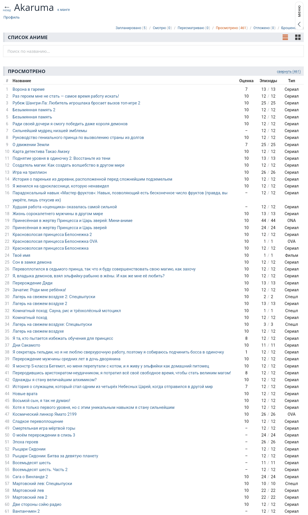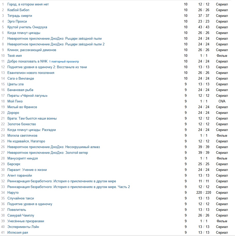 почти все в брошенном без просмотра единой серии (и с оценкой 1 лол), кое-что с просмотром всех серий что тогда по идее должно быть в просмотренном, очень мало того что реально брошено после нескольких серий