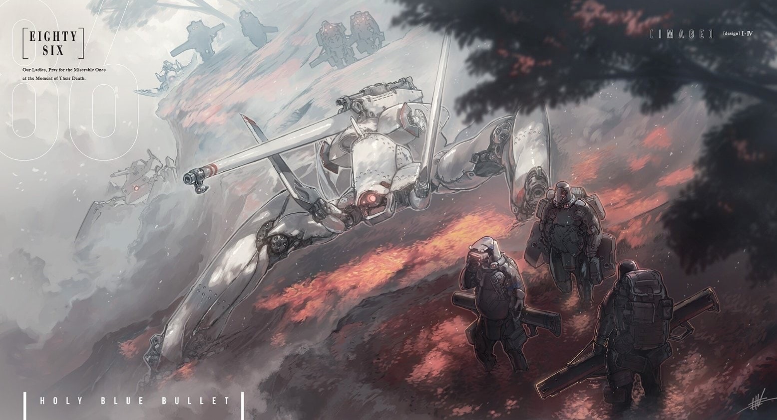 О чём: малолетние дивергенты-трибуты из дистрикта 86 косплеят "Отступника Акито", сражаясь против (БУРИТАНИЯ) не-"Скайнет" с армией насекомоподобных роботов. Не-Акито зовут Шин. Не-Лейлу зовут Лена (Владилена). Да, Лена ВНЕШНЕ немного похожа на Эсдес из "Akame ga Kill". Подростки-солдаты из числа "процессоров"-"восемьдесятшестых" не по своей воле приучены пилотировать "беспилотные" паукообразные шагающие бронемашины-"джаггернаутов", сражаясь на стороне своих беловолосых поработителей-Альба против самовоспроизводящейся армии насекомоподобных роботов под управлением искусственного и не очень интеллекта "Легион".