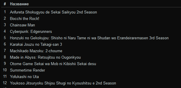 Chainsaw man - самое ожидаемое аниме года, после первой серии думал что не очень, но дальше пошло то что ожидал, хороший юмор. 9/10