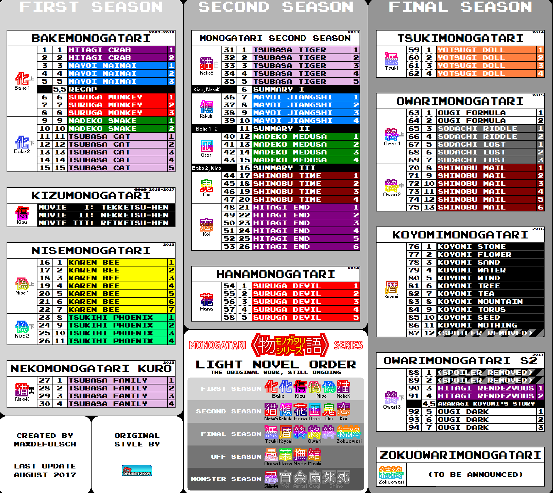 > Bake -> Kizu I-II-III -> Nise -> Neko -> Second Season(Neko White, Kabuki, Otori, Oni, Koi) -> Hana -> Tsuki -> Owari -> Koyomi -> Owari S2 -> Zoku