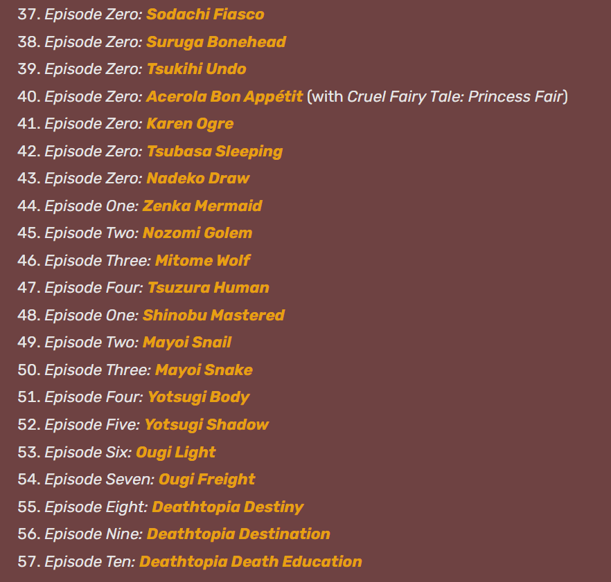 >>7717347 >Owarimonogatari с 4 окт. 2015 г. по 20 дек. 2015 г. >Kizumonogatari 1 8 янв. 2016 г. >Koyomimonogatari с 10 янв. 2016 г. по 27 марта 2016 г. >Kizumonogatari 2 19 авг. 2016 г. >Kizumonogatari 3 6 янв. 2017 г. >Owarimonogatari 2 сезон с 12 авг. 2017 г. по 13 авг. 2017 г.