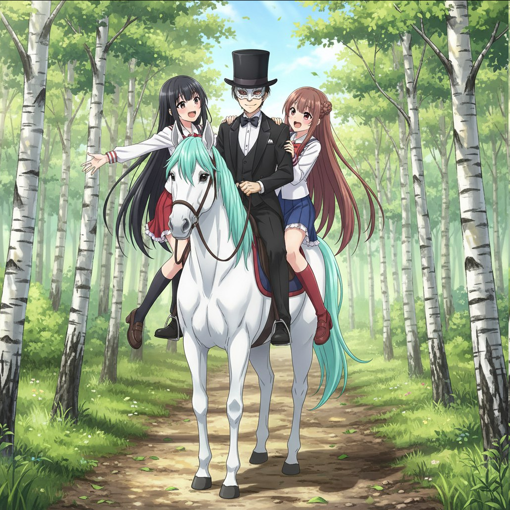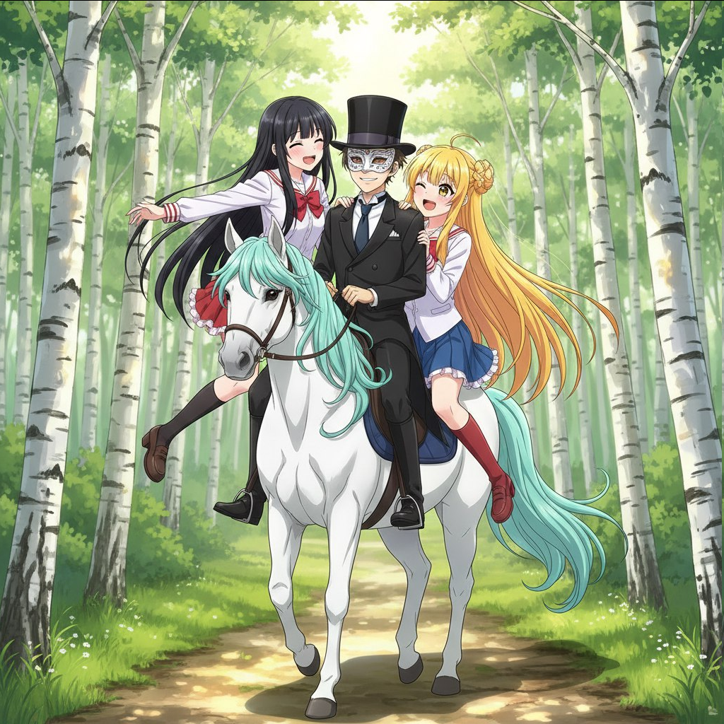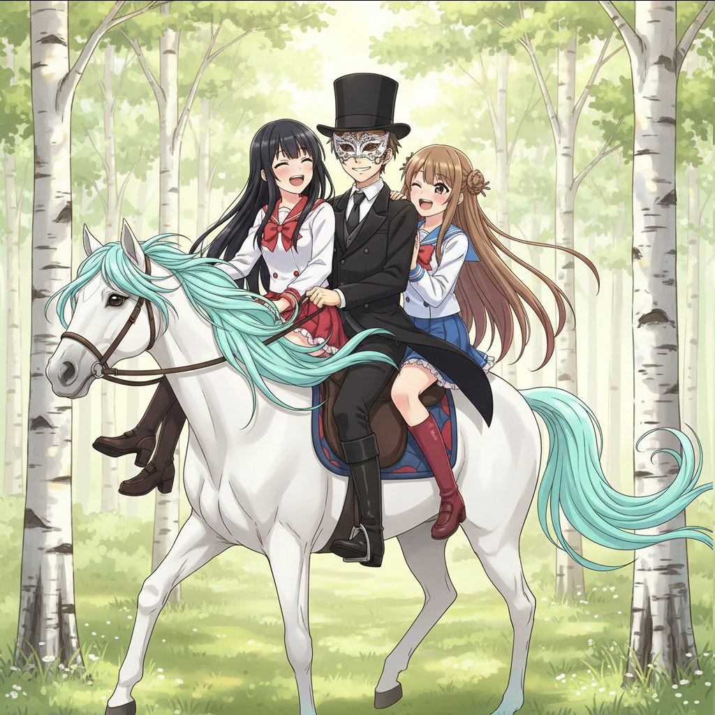 >>7962693 Не надо. >>7961203 Нарисуй картинку в стиле аниме. По берёзовому лесу, днём, едут вместе на одной лошади три человека. Лошадь белая, с бирюзовой гривой. Слева сидит молодая девушка. Она сидит боком к движению лошади, т.е. обе ноги её свешаны в одну сторону, она обращена лицом к нам. Волосы чёрные, прямые, длиной ниже пояса, чёлка средней длины. Она одета в форму японской школьницы белого цвета, но с красной юбкой и красными оборками. Одна рука её закинута назад за себя, другой рукой она держит за плечо следующего седока - мужчину. Обута она в чёрные туфли на высоком каблуке. Посередине сидит молодой мужчина в белой, маскарадной маске, в чёрном фраке, в черных брюках и ботинках и в чёрном, высоком цилиндре-шляпе. Он сидит нормально по ходу движения лошади, как наездник. Смотрит в нашу сторону, улыбается. Одну руку его не видно так как она за ним, другой рукой он держит поводья лошади. Перед ним сидит третий наездник. Третий наездник - ещё одна девушка, она сидит боком, так же как и первая девушка, лицом к нам. Она одета в белую форму японской школьницы, но фасон немного отличается от первой девушки. На груди у неё бант красного цвета. Также на ней надеты красные сапоги по колено с высоким каблуком. Юбка и оборки синего цвета. Волосы длинные, ниже пояса, ярко жёлтого цвета, разделены на две большие, прямые пряди по бокам. Так же в причёске есть два заплетённых небольших шарика из волос сверху по бокам головы, пряди как раз идут от них. Она как и первая девушка прижимается к молодому человеку. Обе девушки повёрнуты лицом на нас, но взгляд их обращён на молодого человека посередине. В глазах их видно сердечки, они смеются и полны любви.