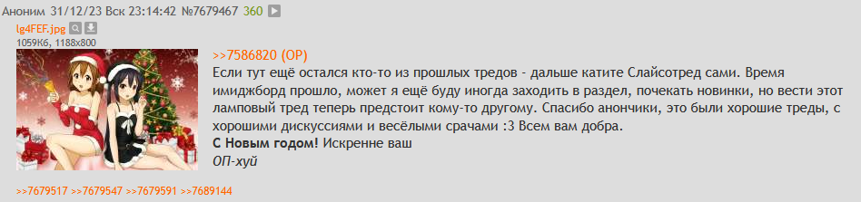 >>7934784 >Странно что никто не обсуждает Странно что вообще хоть кто-то сюда заходит. На борде средняя скорость 10 постов в час, из них половину спамит пидрюха. Я посмотрел кучу слайсов (и не только) за прошедшее время, но желания реактить в каком бы то ни было треде не было. Да и сейчас просто мимо знакомого треда проходил.