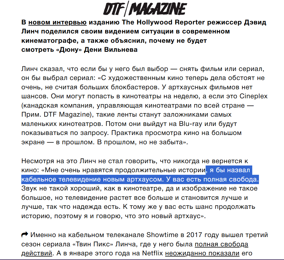 >>7820383 >Иди еще посмотри на рейтинги фильмов линча. Линч тут причем? Количество оценок видишь и количество посмотревших? Где тут намек на нишевую аудиторию не для всех? Это популярные тайтлы. На сайте буквально есть рейтинг по популярности. P.S. Ладно, приплетем обратно Линча, может тогда шевеление в голове начнется. Посмотрим на том же imdb: твинпикс 222к оценок, 8.8, популярность 220 бабушка 7.5к оценок, 7.1, популярность - Первое - хорошей триллер детектив, народу зашло. Второе - не для всех, ценители посмотрели. На мал-е артхаус не для всех тусуется, условно, на 5к и дальше по популярности вперемешку со всяким говном. Вот там не для всех. РЕЙТИНГИ ВРУТ, ЛЕЙН АРТХАУС, СМОТРЕЛ ТОЛЬКО Я И КИНОКРИТИКИ, ЛАДНО, ТЫ МОЖЕТ ТОЖЕ СМОТРЕЛ, НО ТЫ НЕ ПОНЯЛ ЧТО СКАЗАЛ АВТОР, РЕЙТ НА 8 С 300К ОЦЕНОК НЕ ПОКАЗАТЕЛЬсерьезно?