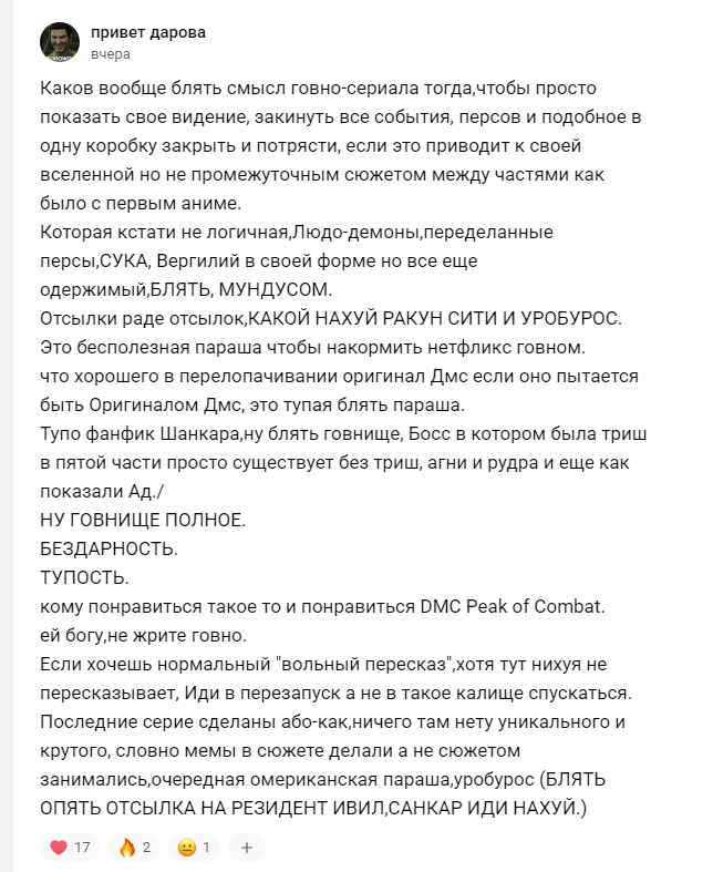 просто эта леди - она вообще нахуй не нужна как центральный персонаж. ДМС вообще не про неё. она была второстепенным персонажем в дмс3 и камео в дмс 4 и 5. всё. и так то даже похуй, если бы куколфликс сделал бы отдельный мульт по ней с вот таким вот ребутом персонажа, а данте просто был бы камео на 5 минут в одной серии - тогда похуй + похуй, пусть там сильствиует и независимуствует и женщинствует. так нет же, блять, эти ёбаные пидоры взяли одну из моих любимых серий и персонажей, и сделали по ним полное сжвшное говно. И! что самое хуёвое - я в своей жизни уже не увижу нормальной экранизации дмс. сейчас это говно от нетфликс еще пару сезонов отживёт в течение 4х лет. потом следующий ребут экранизации будет в лучшем случае через 15 лет.