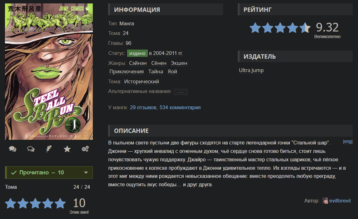 А как джоджолев закончился? Я вообще как-то упустил этот момент. Помню, заебался на онгоинге и дропнул после файта с младенцем. По итогу норм часть? И что там с 9, где гг бандит трап?