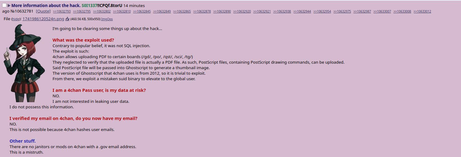 >>7869853 Потому что тупые школьники. Они даже не ломали сайт, они воспользовались полным равнодушием Хиросимы и смогли пропихнуть своего человека в модераторы. После чего слив стал делом техники. То, над чем они ржали, это абсолютно нормальные вещи для имиджборды. Это просто потрясающе, что спустя двадцать лет 4чан сломали не какие-то элитные хакеры, а самые настоящие школьники-дебилы.