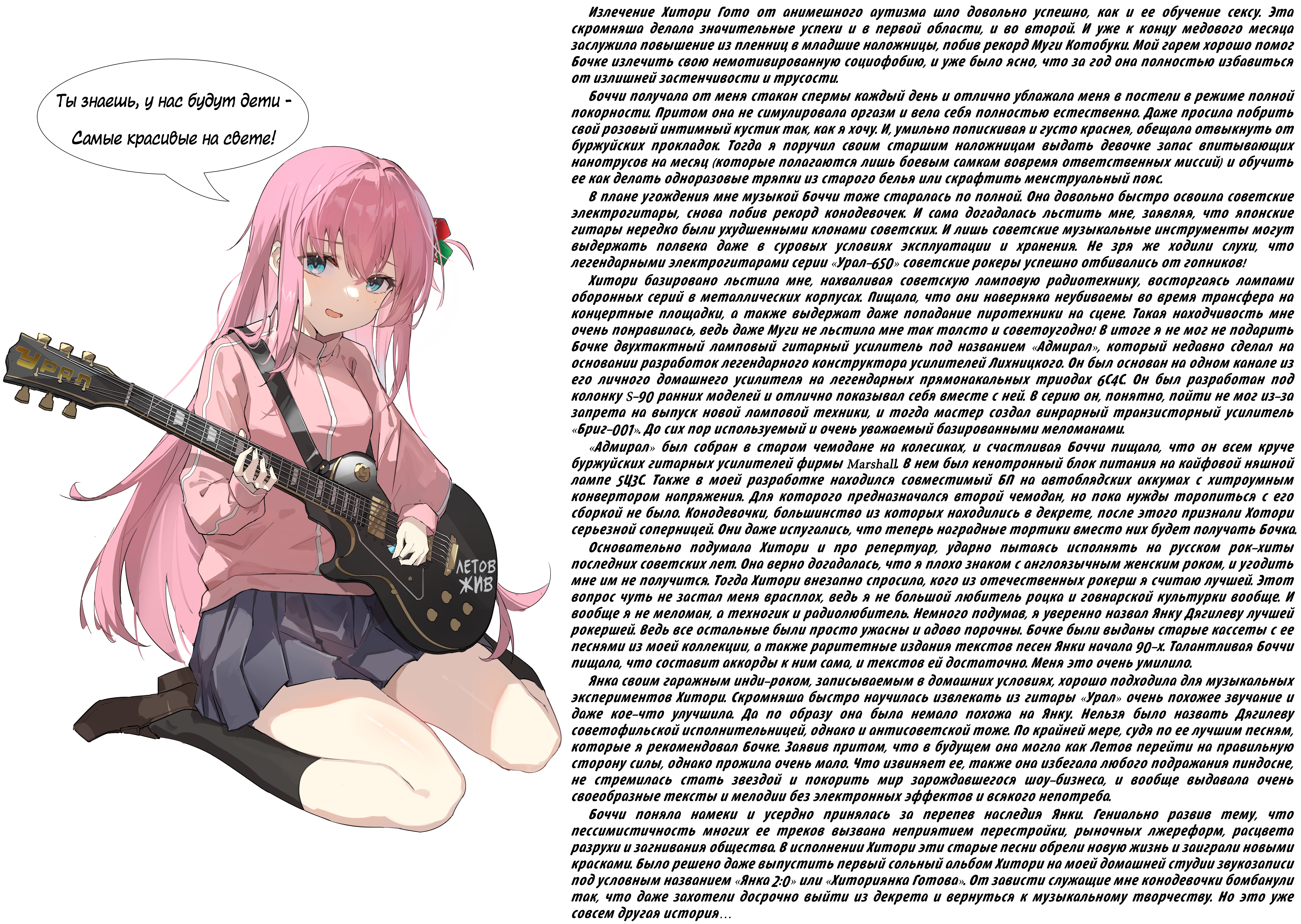 >>7915939 Не понимаю, как тебе такое может нравиться. Вот вообще. Я наоборот радовался сначала когда в бангдриме видел все эти репетиции с гитарой без комбика (ну, в кейоне тоже было), а потом и вовсе оргазмировал когда в новых аниме началась мода приближать звук к "сюжетности" — например, в Бочке хорошо звучит только гитара, ибо гитаристка задротка лютая, а остальные инструменты звучат блекло. Причём именно блекло, не "плохо" — они попадают в ноты и сыграны, но видно банальный недостаток опыта у каждого участника. Та же тема в Рок Леди — гитара и барабаны звучат хорошо, так как там хоть и школьницы, но впитавшие все эти ваши ледзеппелины с молоком матери, и тренировавшиеся далеко не пару лет. А вот из неумелого синтезатора сделали целую сюжетную арку, и звучит оно охренительно. Рок Леди сейчас вообще моё любимое музыкальное аниме, там самая настоящая и классная музыка из всех, что я слышал в принципе, да и у себя с ГГ я вижу столько общего, сколько ещё не встречал. Возвращаясь к коню, как-то вкидывали "настоящую" запись их песен, где были те же исполнители, но песни они играли намеренно плохо, так, как по их представлениям должны были бы играть настоящие Юички да Адзусы. Мне эта запись куда больше оригиналов понравилась. Хотя, по справедливости, её я не переслушивал, а вот оригиналы очень много раз. >>7916464 Не особо. >>7918901 Вот только смотрел, то ли кими ни тодоке, то ли ахарен... вроде первое. Там в классе куртки на крючок вешали. Так, по-моему, удобнее. Крючки так и так покупать придётся, но с гардеробом получается лютый толпняк после последних уроков, который только лишнее время сжирает, непонятно зачем.