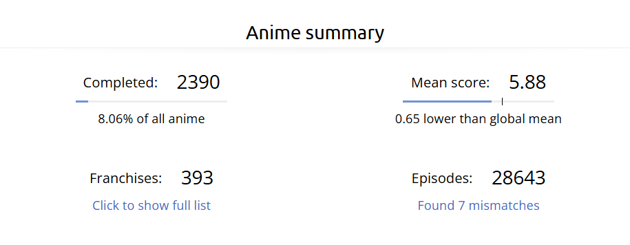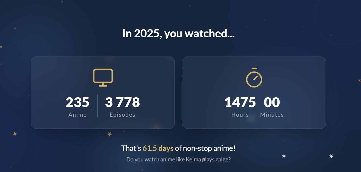 Я смотрю аниме большую часть своей осознанной жизни и не понимаю, как вообще преодолеть порог в 365 дней, я поставил себе такую цель не так давно и начал замечать, что ну очень долго это всё идет. Хотя я понимаю, что я не смотрю 24/7, и, возможно, играет роль, что я начал подмечать, сколько добавилось дней, но все равно ебать это долго стало всё. Сейчас у меня 220 дней, думаю над тем, чтобы таки осилить ванпис и покемонов, в детстве только моментами смотрел, но полностью никогда еще, считаю, что классику знать надо и когда-нибудь да доберусь до них. Но пока смотрю по 5-6 аниме с сезона и 2-3 каких-нибудь с прошлых сезонов.