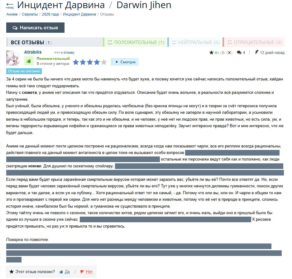 Вот например рецензия на онгоинг Инцедент Дарвина, там просто набор фактов и вывода нет.