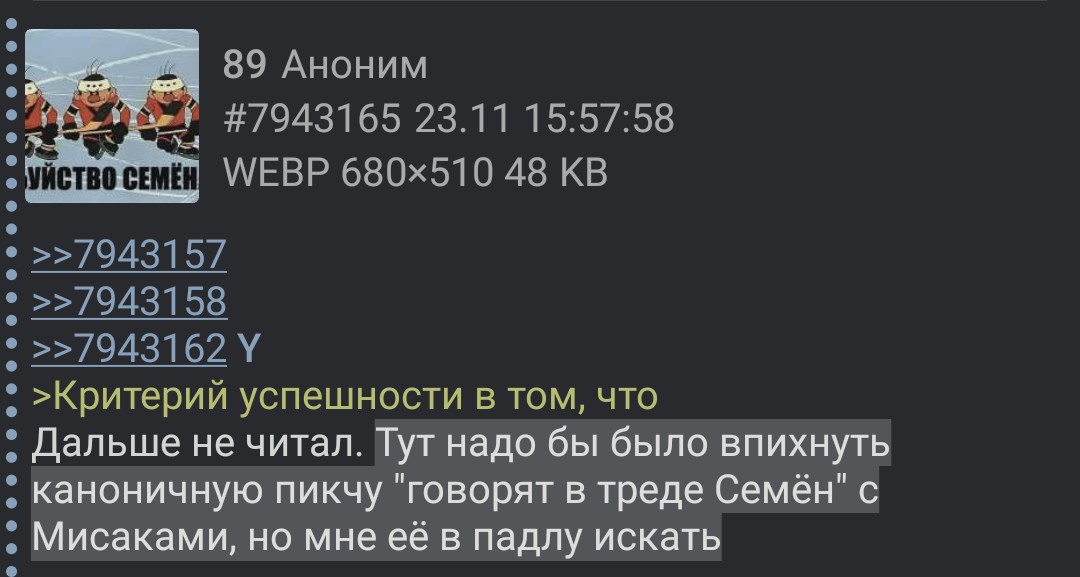 >>7943157 >>7943158 >>7943162 >Критерий успешности в том, что Дальше не читал. Тут надо бы было впихнуть каноничную пикчу "говорят в треде Семён" с Мисаками, но мне её в падлу искать