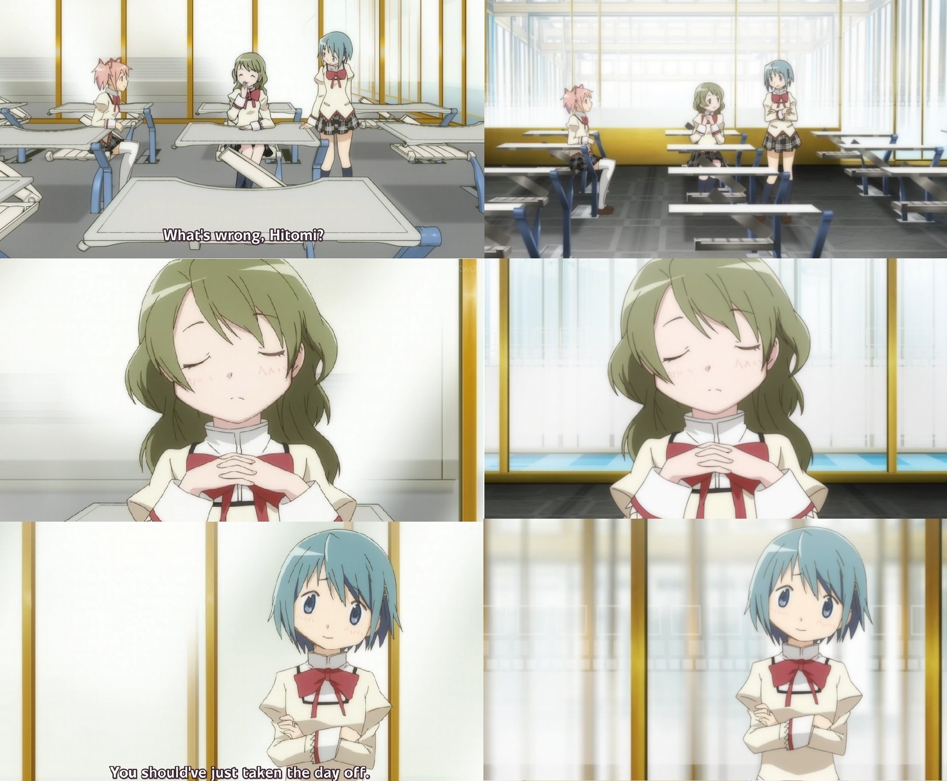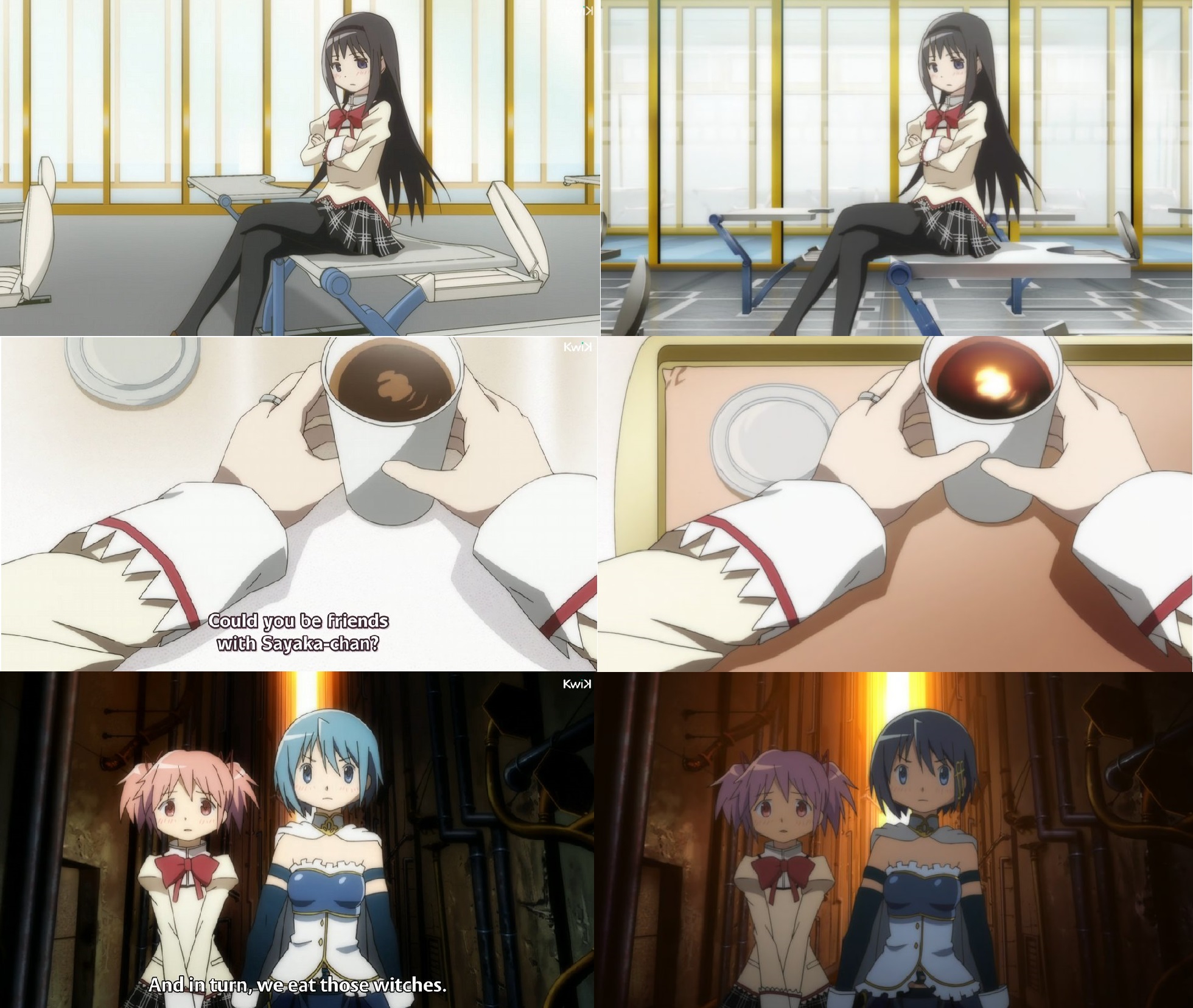 Шафты не могли просто остановиться и перестать переделывать Мадоку. Еще несколько примеров почему то, что сейчас выходит по тв это не совсем "мувики в тв-формате" - вот эти сцены в мувиках вырезали, но сейчас вернули, однако не просто вставили из твшки, а переделали их под сеттинг фильмов.