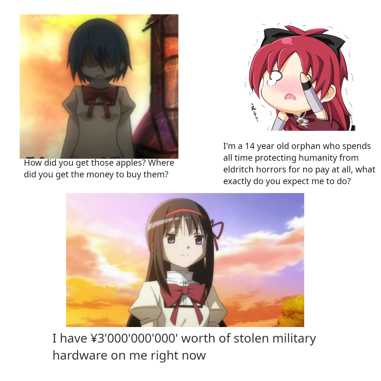 >У нас вот есть Саяка, Кёка, Мадока, Мами(с ней чуть сложнее) - почему им нравится идея девочек волшебниц? Не потому, что они хотят быть объектами спасения - они сами спасать хотят. Им именно это в этой идее нравится. Вот тут ты совершенно не прав. Чтобы понять почему их этот идеал привлекает, надо сначала понять, когда и почему они этот идеал отвергают. Почему Кёко отвергает идеал махо-седзе, когда ее отец сжигает ее семью? Почему Саяка отвергает этот идеал перед превращением в ведьму? Если они действительно только хотят спасать, то почему же они не принимают это положение вещей и не продолжают спасать людей, пока их тело не откажет, аля mind of steel Эмия Широ? Потому что они на самом деле ожидают, что если они будут помогать людям, то кто-то поможет и им в их худший момент. Они не спасают ради того, чтобы спасать, для них спасение - это плата за будущую помощь. Они сражаются за людей, чтобы кто-то где-то потом сражался уже за них. И когда этого не происходит, они разочаровываются в этом идеале. И Мадока возводит это в абсолют. Она всегда где-то сражается, и сражается за всех.