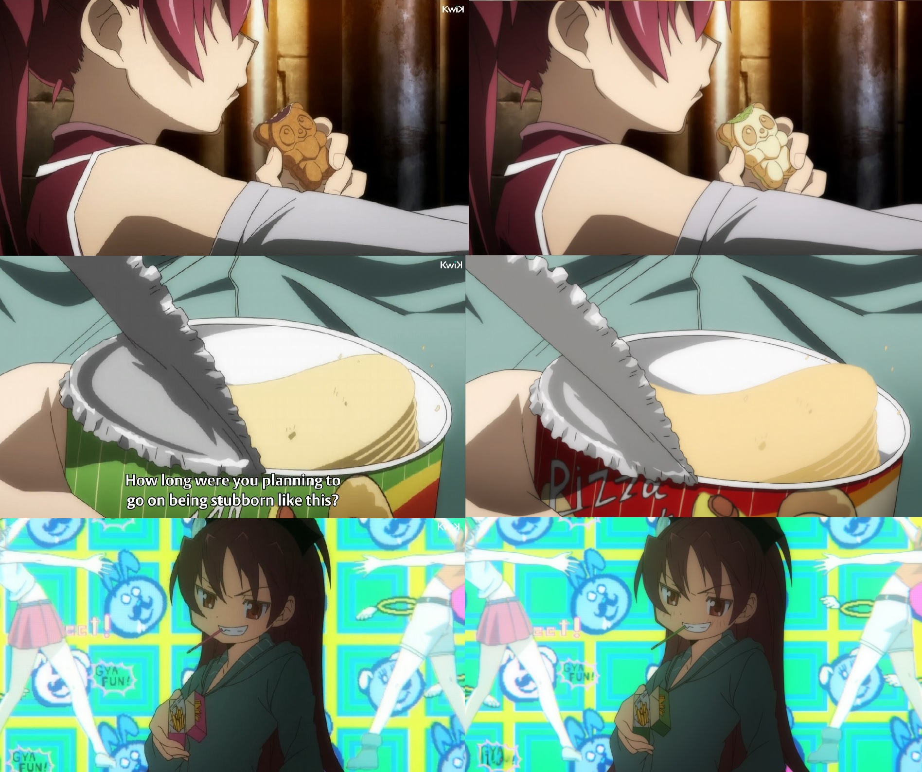 Интересно, что из всех изменений в новой тв-версии мувиков-компиляций, что сейчас выходит на японском тв, самая последовательная - это изменения того, что жрет Кёко. Причем это такой ранинг-гаг - некоторые из этих изменений имеют три итерации: оригинальная тв-версия —> версия в мувиках-компиляциях —> новая тв-версия, хотя теперь это совсем тотально - вообще все сцены, даже если это всего-лишь цвет начинки тайяки. Я это к чему: разумеется на одном уровне это просто такая автор/зритель экономика, где внимательность и глубокое знание материала фанатам должна быть вознаграждена, так что такие вот пасхалки закладываются специально. Но вот эта вот тотальность и выбор именно одного элемента напоминает мне слова Симбо в одном интервью, что он рассматривает мувики+ребелион как самостоятельную вещь, где ребелион это сиквел именно мувиков, а не сериала - и при этом он ссылается на изменения дизайна персонажей(например заколки Саяки) как указания на это. Почему бы тогда не рассматривать и вот эти изменения Кёкиной жратвы как такое же указание, что это некая параллельная вселенная? Кстати, еще вспоминается этот несколько раз возникающий в магии рекорд сюжет о такой Увасе - что-то типа "эффекта Манделы", когда ты замечаеешь некий артефакт, котрый слегка отличается от того, каким он должен быть - и это оказывается вещь из паралелльного мира, в который тебя может затянуть. Какая разница? Да никакой, просто любопытно, хотя например тогда можно предположить, что вырезанные сцены значит в этой вселенной и не происходили.