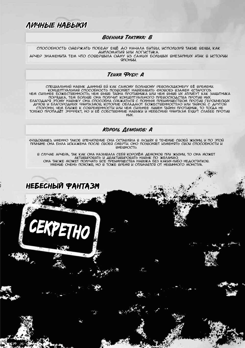 Король Демон Шестого Неба: Ранг:Е/EX Тип: Анти-Бог Истинный Фантазм Великого Оды Нобунаги, разрущающий Синтоизм и Буддизм. Превращает её в существо, имеющее абсолютную власть против божественных и мистических существ. Кристаллизация фантазма, основанного на сожжении храма при жизни. Призывает пламя, являющееся концентрацией страха и почтения, накопленных последующими поколениями. Делает трудным для божественных существ даже поддержание своего существования в этом Зеркале Души, в то время как обычные Слуги с низкой божественностью чувствуют лишь лёгкий жар. Во время активации фантазма одежда с тела Арчера пропадает, оставляя её полностью обнаженной.