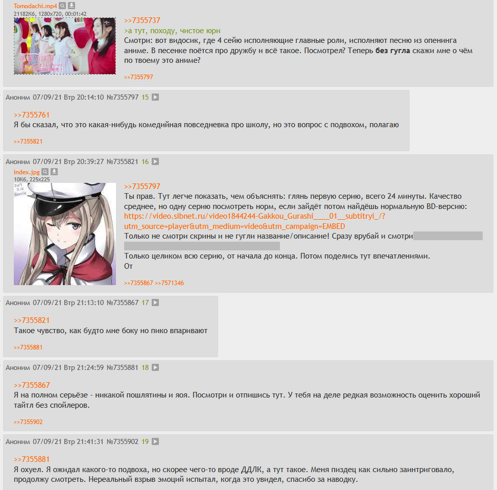 >>7947856 >Только в конце предпоследней серии признание, и всё Так в том и прелесть: если не жопой смотрел, то на тебя сразу вываливаются воспоминания и понимание всей херни что мальчик с девочкой творили до этого - всё было просто потому что у них доки-доки друг от друга.