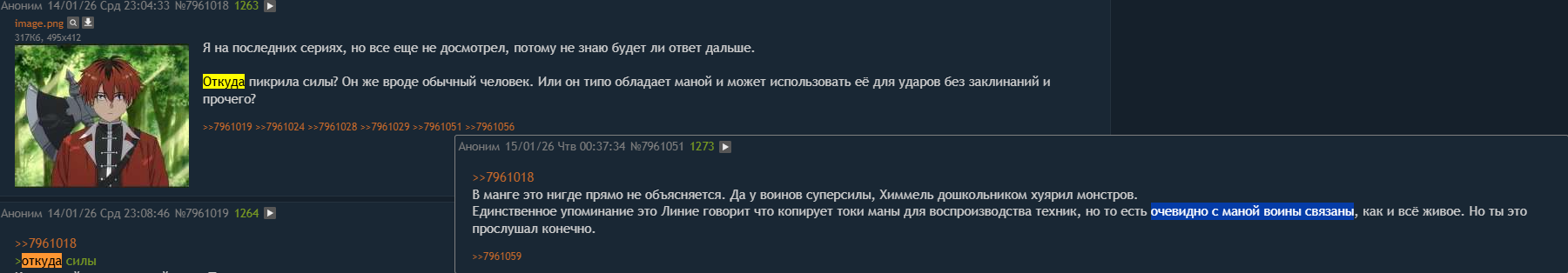 >>7967338 >Так они жрут ровно то, что находят, а не находят то, что хотят сожрать. >>7967339 >Это аниме про еду, про то что они готовят и параллельно приключаются. Для меня это натянуто, тем более что аниме про еду. Уж слишком дохуя всего они находят на ограниченном пространстве. А там еще другие шастают, которые банально затопчут и перебьют монстров, чтобы не шастали. >Ты мне кажется туповат для анализа художественных произведений Я не пытался для этого надо полностью смотреть. Мне не понравился конкретный троп и все.