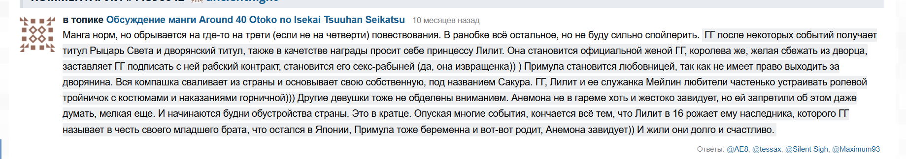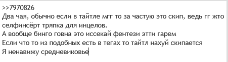 Я уже просмотрел кучу низкосортного исекала и фентезикала, а мне хочется еще. Все эти накалы страстей, сложные человеческие темы, это конечно отлично, если они сделаны хороши, но так или иначе вызывают некое напряжение. Не хочется мне видеть в маняме то убогое, что я вижу или о чем я знаю, что есть в реальном мире. Зачем в очередной раз поднимать ту неприятную тему, о которой мне уже известно? Я ничего не меняю, ничего не решаю, в моей власти только мое отношение к проблеме, мой мозг может только рано или поздно найти "выход", найти паттерн мышления, который закоупит проблему. Так что я хочу смотреть на приятное. А темы сложные, неприятные, оставьте нормисам - им если не ткнуть в них, то они о таком и не задумываются. Им это полезно, а мне уже нет, только лишний негатив.