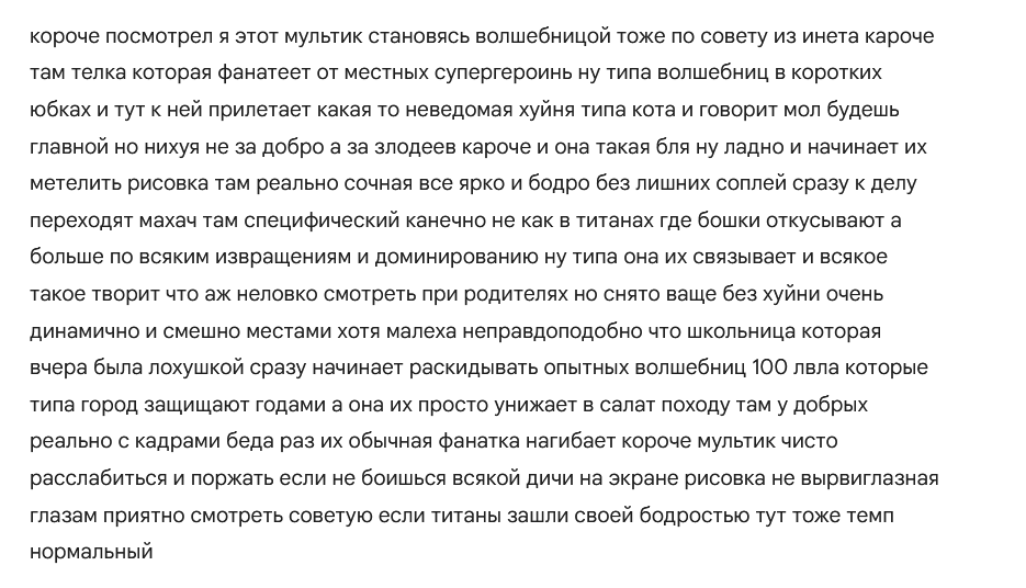 >>7971558 я не понимэ вы сабы по слогам читаете что ли? это все сканируется взглядом за 0.02с тем более мяниме это просто картинка где за веревочку рот 1 персонажу дергают
