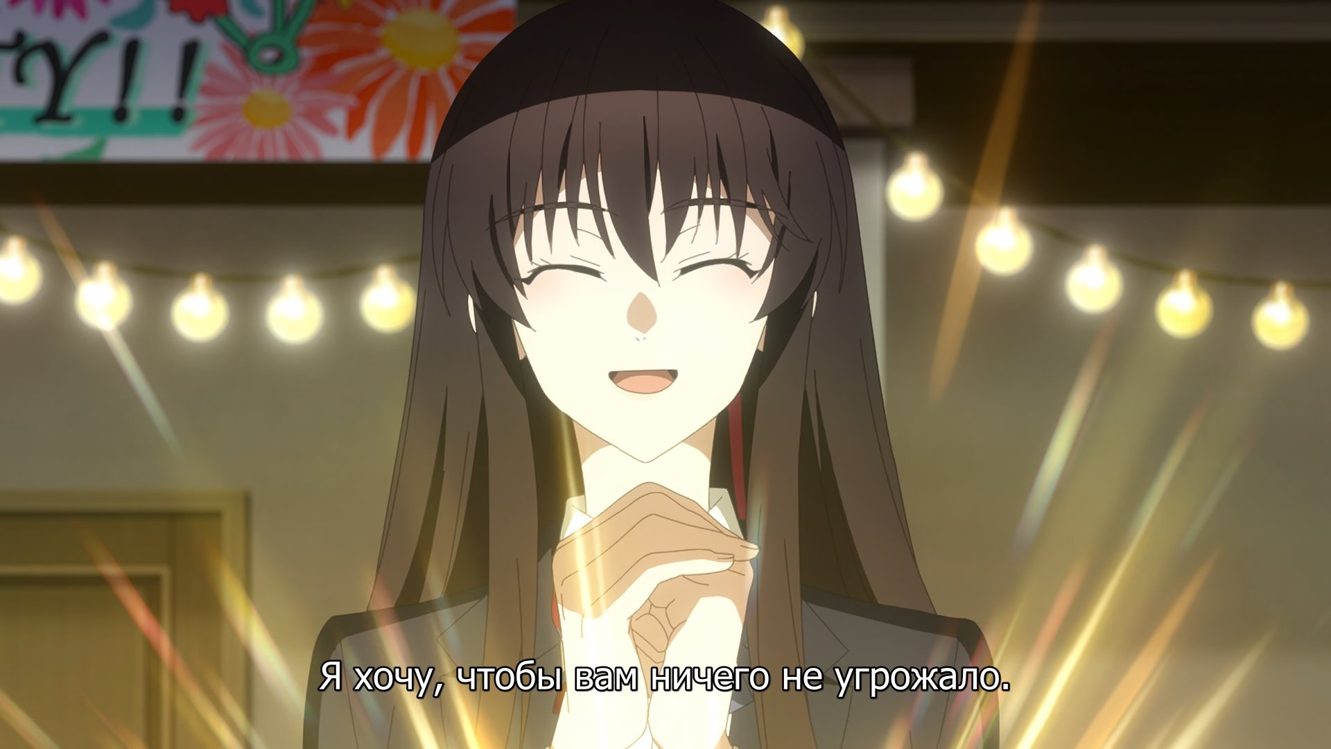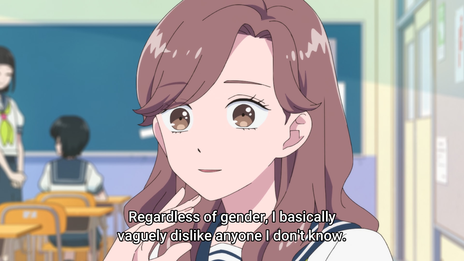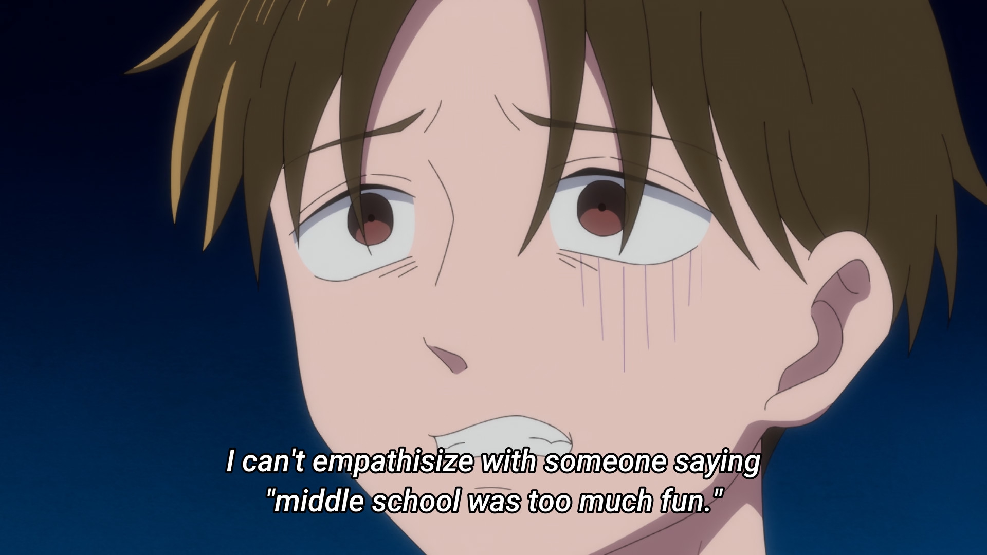 Я обожаю что в этой аниме отношения показываются как тривиальные и простые, без всяких инфернальных драм и хождений кругами. На страдание локального блэкпильщика вообще весело смотреть, надеюсь что хотя бы под конец он выкинет хуйню из головы.