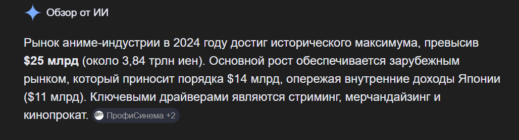 >>7971962 >>7971961 Ну хз, чёт слабо верится, да и то что по нетфликсу показали несколько аниме это не значит что каждый додик с подписочкой обязательно сука его посмотрел и отчитался, а не скипнул. Да аниме стало довольно популярным по сравнению с нулевыми но не настолько как вы толкуете. Аниме индустрия как была 20 миллиардов в год, так и остаётся, киноиндустрия и игровая индустрия перевалили за 300 миллиардов, вот не ошибёшься если скажешь что нормисы смотрят фильмы и играют в игры, это да, тут по цифрам как раз всё сходится