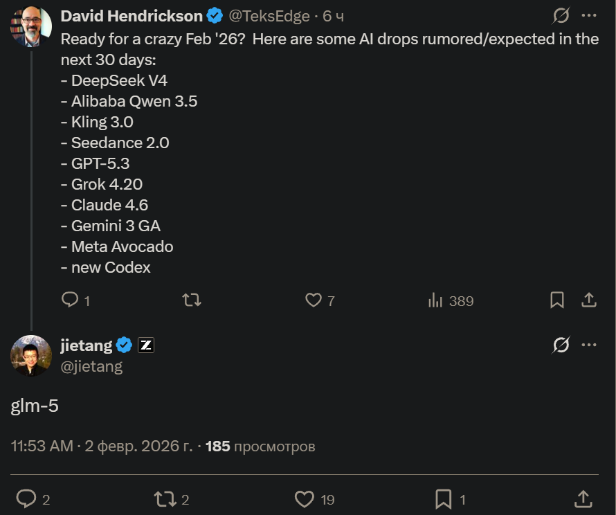 Появление GLM-5 было ожидаемо — компания анонсировала новую модель на Лунный Новый год (февраль 2026). GLM-5 позиционируется как следующий шаг с усиленным рассуждением, кодингом и агентными возможностями.