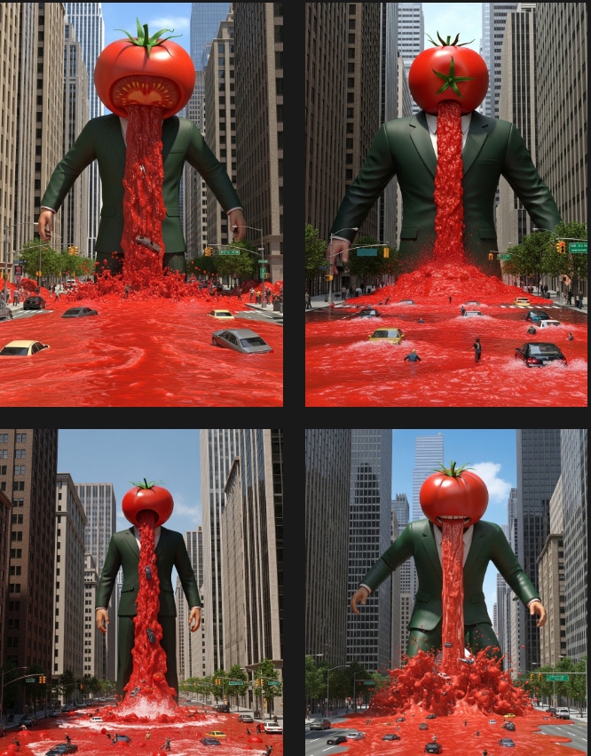 Giant man wearing dark green business suit with big tomato instead his head standing on the street with his feet. Street surrounded with high buildings. Tomato-giant vomits with tomato paste and juice down on the street with cars and people. The flow of tomato paste with waves carry cars and people and floods the street.