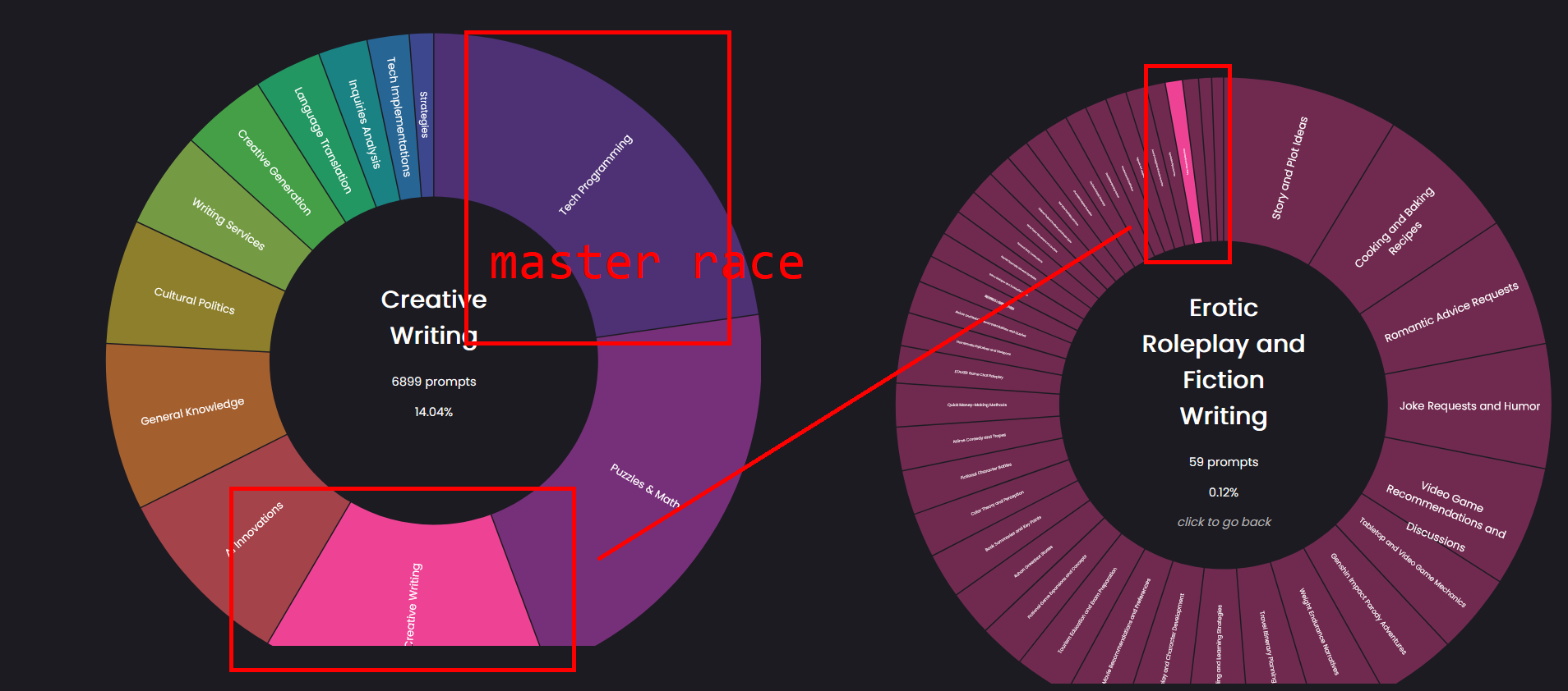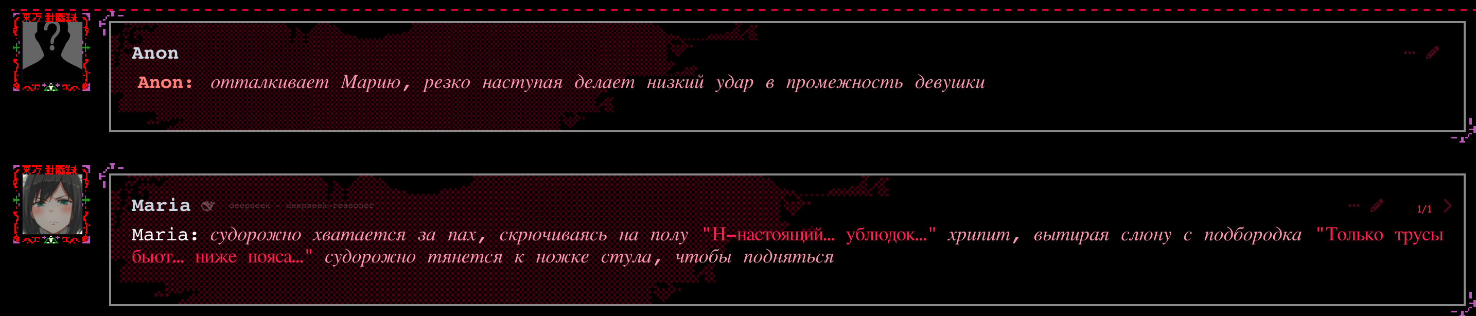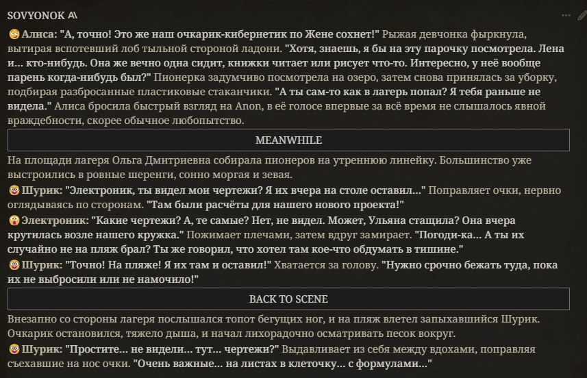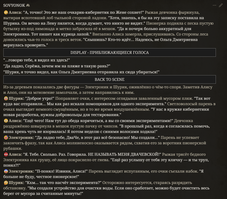 - Вроде пофиксил протечки меты в ризонинг версии - Новый рычаг на GM Narration, единственный более-менее способ снизить действия в наррейшене, но может лупиться. А лучше просто стать четвертьжопером и позволить сетке писать за себя. - В ризонинг версии рычаг на рандомизацию разговоров - В безризонинг версии пробив OTHER в префилле (аутпут фильтр который text empty/no candidate еще не пробивал) - Удален [BACK TO SCENE] транзишен, заменен конструкцией вида [транзишен - END]