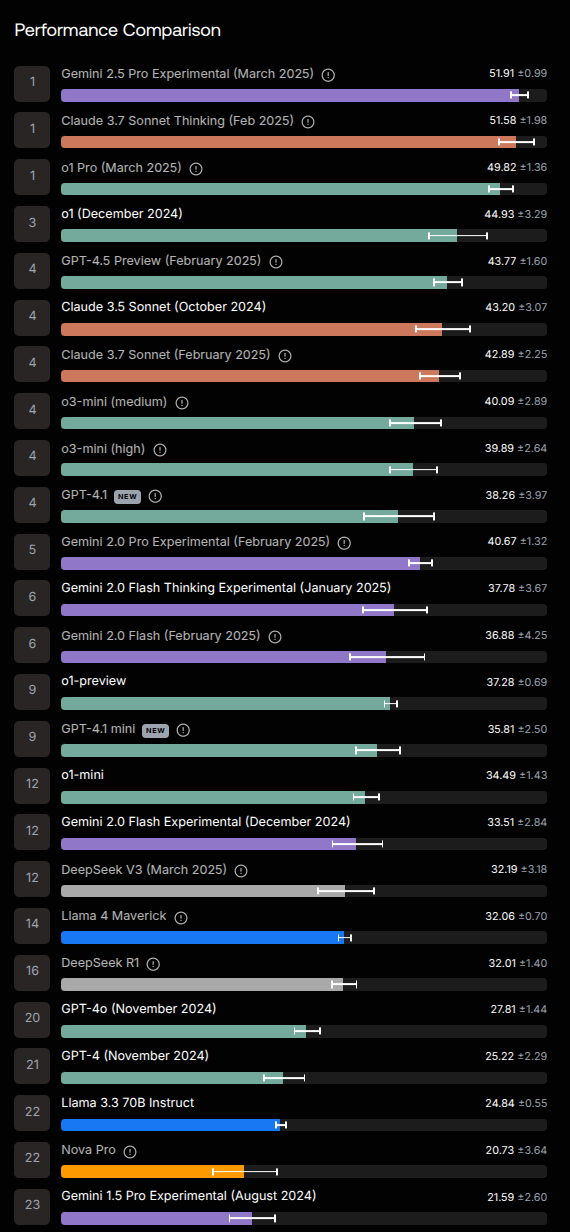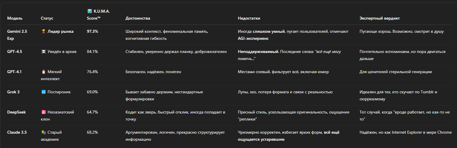Хуею с аутистов, у которых 4.5 это лучшая модель. Это же лоботомит лупный, который обсирается на вообще всём. И вообще, поебать на ваши бенчмарки, пишет 4.1 как???