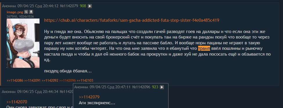 Скачал один пресет из шапки, а там нтр. Скачал второй, там чар становится мамкой. Надо мне тоже опубликовать пресет который будет топчик, но с скрытой fempov инструкцией. Если юзер - кун, то он станет сисси и свапнется гендер, будет "она". Чтоб знали.