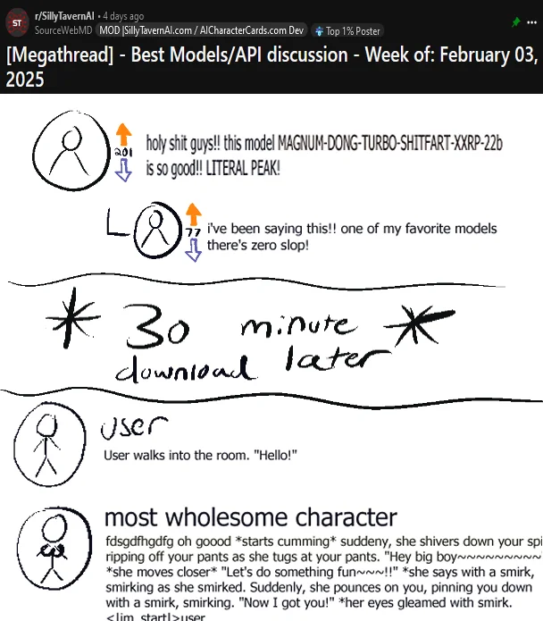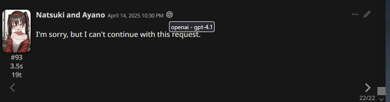 >>1153428 Чет ты не так делаешь, я сидел на локалке до того как перешел на корпосетку и у меня они писали охуенно. Не настолько прям сильно хуже корпосеток, но похуже, да. Если бы локалки были лучше, то я бы на корпосетки и не переходил бы. Но не было так плохо, как на твоем скрине. Я сидел на 27b мистрале и на джемме 27b от гуглов, на файнтюне магнум прям как в меме том, но у меня прям жестко боты не писали про секс сразу же как в том меме. В принципе писал этим ботам и они отвечали нормально так, более менее. Локалки так-то довольно умные и без цензуры. Надо бы попробовать снова локалки, давно не пробовал после перехода на корпосетки и сравнить разницу между локалкой и корпосеткой, тогда, когда я на локалках сидел я был неискушенным в плане сеток, а сейчас может, после копросеток будет более заметны проблемы локалок и уже не смогу ими пользоваться как раньше, да, ну нужно будет посмотреть оценить последние локалки ещё раз, а то давно не пробовал и понять в чем разница с корпосетками. Может в тред отпишу рецензию по отличию локалок от корпосеток. Я себе купил 4090 специально чтобы локалками пользоваться. Ну не только для локалок, еще на 4090 картинки/видосы нейронками генерил, тоже весело было. Так что о покупке не жалею. Правда у какого-то наебщика купил 3090 и она черный экран выдавала, ну я вернул назад, деньги, слава Богу, вернули тоже, но осадочек остался. Больше никогда не буду покупать БУ кал, лучше переплатить и купить новое, чем за пол цены но у какого-то долбоеба и поломанное.