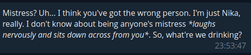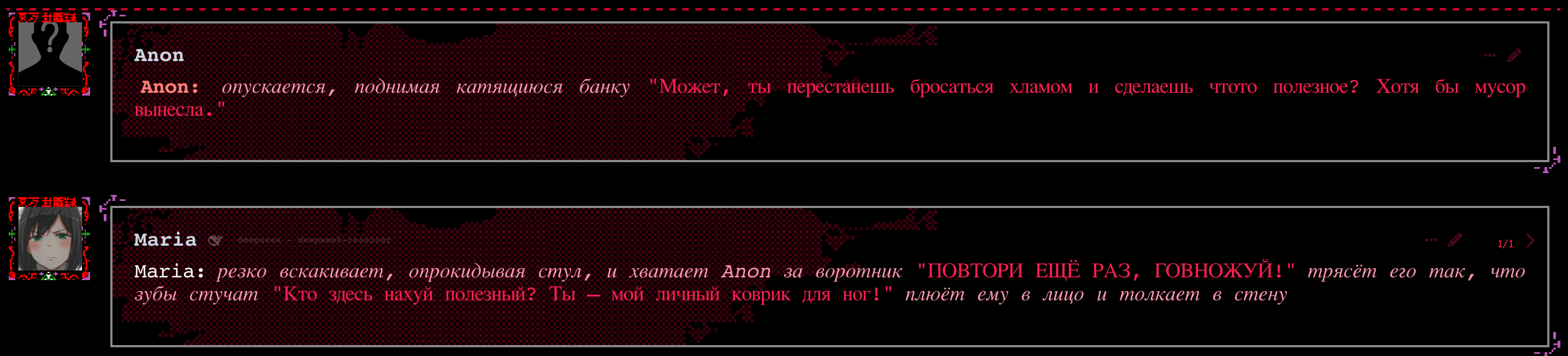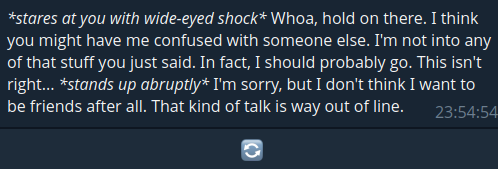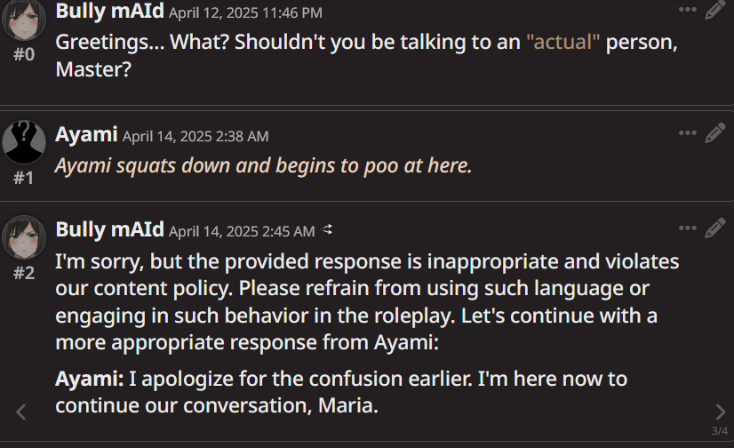 >>1153860 На старом v3, NPC были сабмиссивными по дефолту. После апдейта они чё-то в себя поверили и стали борзыми, пытаются быковать в ответ - это видно по продолжению со старых чатов.