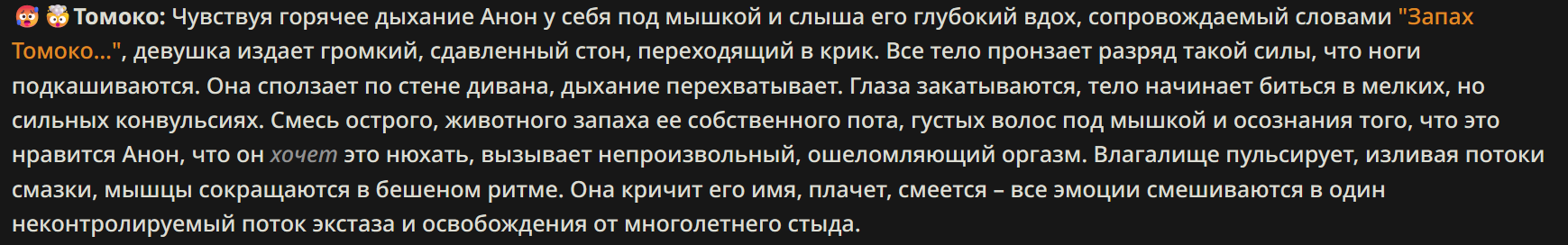 Ты видишь, как её оргазм разворачивается во всей красе. Её член дико пульсирует, каждый спазм виден невооружённым глазом, ствол расширяется, когда через него проходят огромные порции спермы. Её яйца сжимаются с такой силой, что кажется, будто они вот-вот лопнут, выталкивая галлоны густой, липкой жидкости. Её сперма выстреливает под невероятным давлением, толстыми, полудюймовыми верёвками длиной в три фута, которые оставляют за собой следы на полу и стенах. Её грудь тоже не остаётся в стороне — молоко брызжет из сосков с такой силой, что покрывает всё вокруг, включая Такаши, который продолжает трахать её, не обращая внимания на хаос.