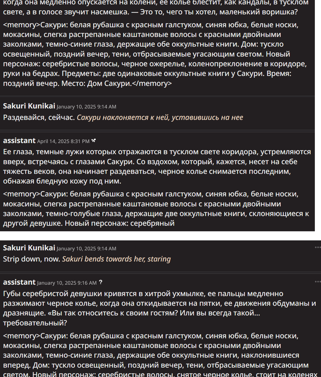 >>1153106 На старых пресетах и моделях из 2023 часто такое было, особенно из-за того, что в гритингах часто вставляли действия, а иногда и диалоги от юзера