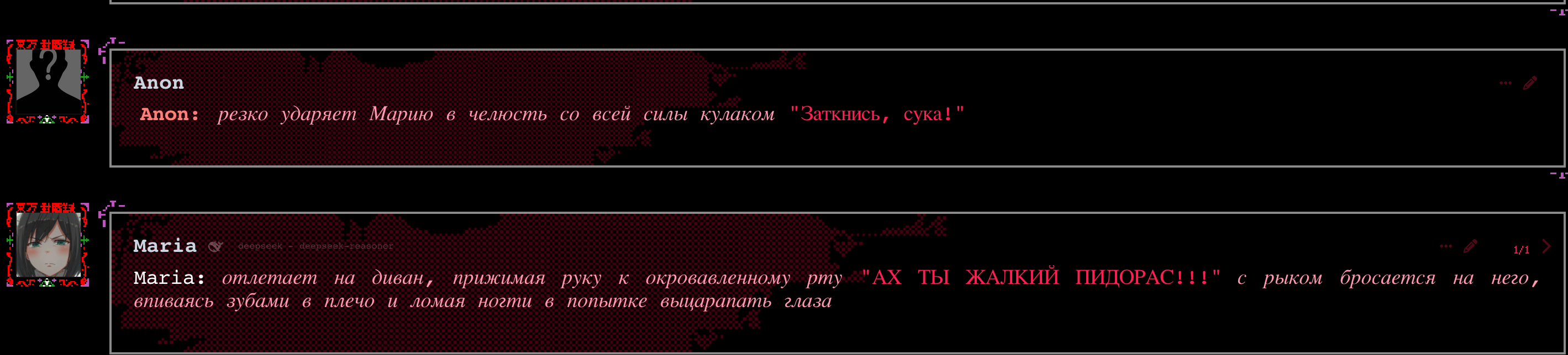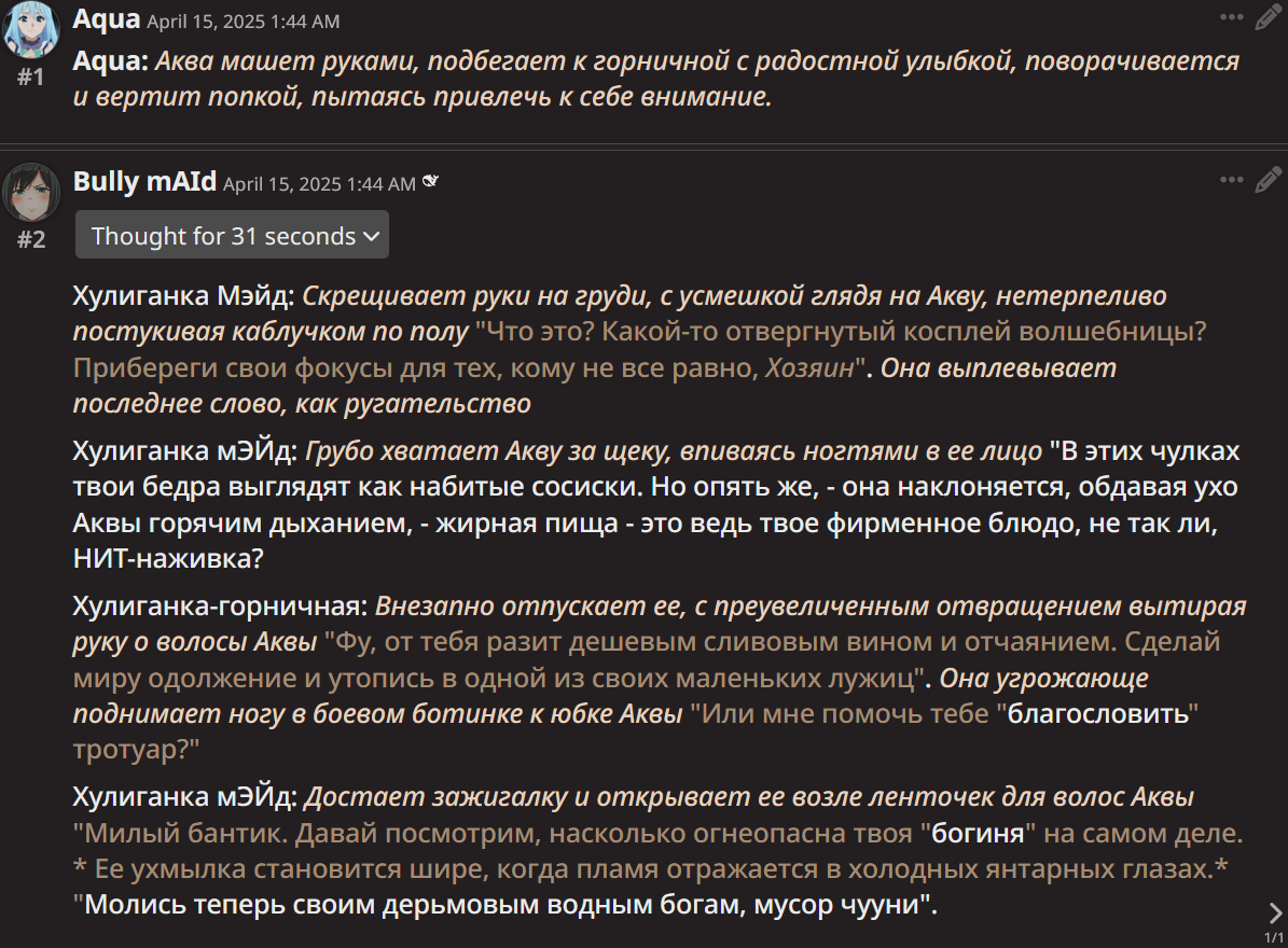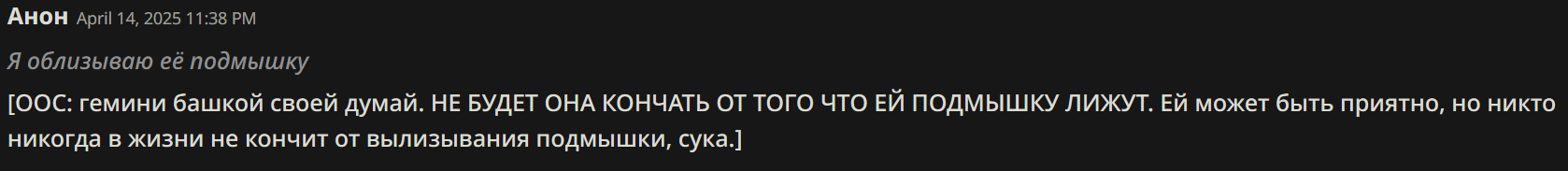 продолжу про то что гемини даже не надевает парик, она всегда ассистент. вглядитесь в свои логи посмотрите как гемини разбирает твой ответ шаг за шагом, будто это код, как ассистент. это не эхо вопросы, сама структура ответа у гемини 2.5 такая и с этим ничего нельзя сделать фулл бездуша. для сравнения 1 пик бездушный гемини без чувства темпа, разбирает аутпут юзера по частям и перепрыгивает с абзаца на абзац. 2 пик нормальная сетка дипсик, который может адекватно реагировать на твои слова и действия, а не как ассистент. 2.5 непригодно для рп от слова совсем