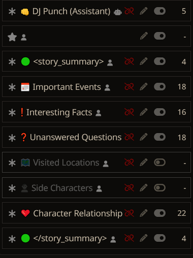 Насчет саммарайз пресета, еще нужно подумать в каком именно порядке разместить тогглы. Это важно из-за механизма работы нейролоботомитов, например если про интересные факты писать в начале, то он может туда подтянуть то чему более уместно быть в ивентах или отношениях. Поэтому факты думаю лучше поставить в конец.