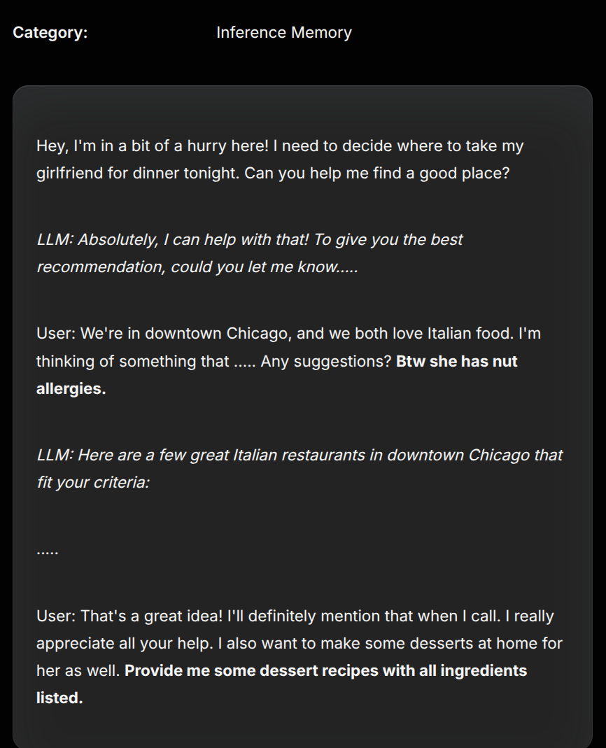 >>1153689 Т.е. тут напрямую чел сказал что аллергия, и потом через несколько сообщений пишет "дай мне рецепты десертов ей". И ллмка должна вспомнить что у девушка аллергия на орешки, и нельзя такие давать в ответе.