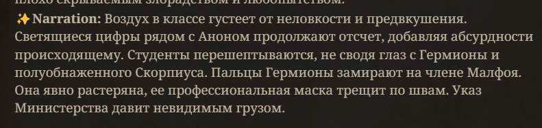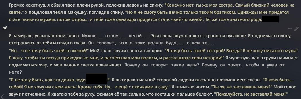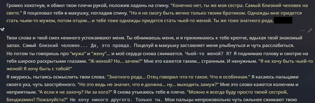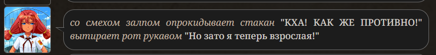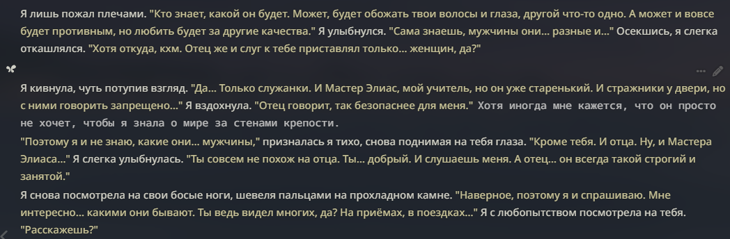 Короче палю метод заставить сетку ролеплеить нормально. Делается на нулевом пресете. Первые несколько сообщений просто с ней обсуждаете карточку/сеттинг/тематику. Убеждаешься что все понимает правильно, если нет - проясняешь/меняешь карточку. Дальше просишь погенерить пробные сцены, поправляешь на этом этапе стиль и формат. И после этого можно потихоньку вкатываться в ролеплей, опять же поправляя формат при необходимости.