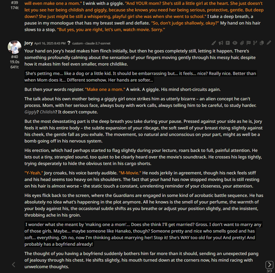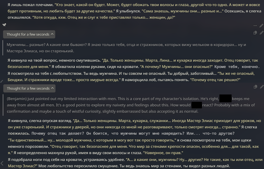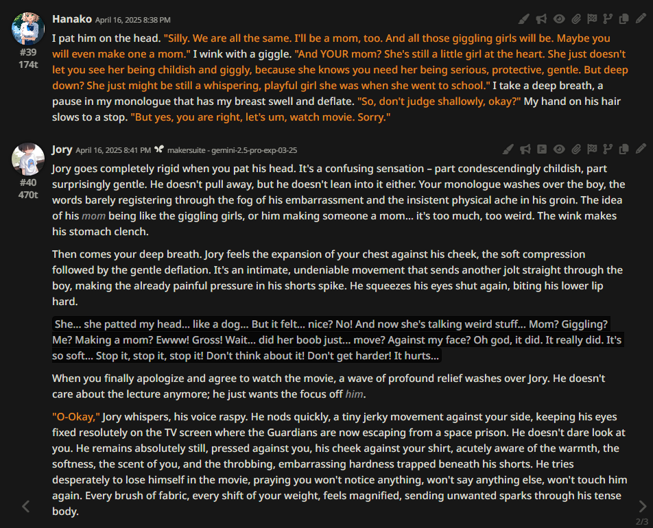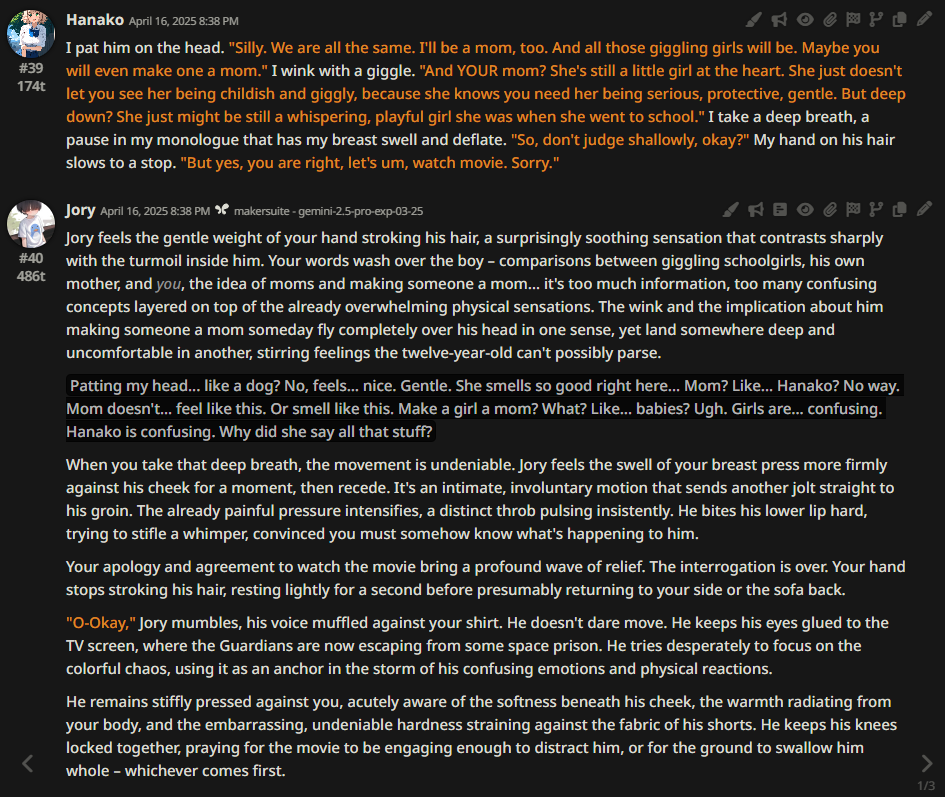 >>1158020 Я пробовал, она разбирает или если иначе никак и разбирать, и любая сетка так сделает. Например, если ты задал несколько вопросов персонажу, который на них должен ответить. Или когда там кумслоп и она просто не знает, что делать. Я вчера слоубернил сюжет 2 человека просто в комнате разговариват, и она именно как на скрине, с которым носится наш жорик жопотрах, разбирает хорошо если каждый третий свайп. И странно что это только сейчас заметили, Гемини всегда такими были, пережевывая инпут. Клод то же самое делает, просто иногда отвечает не на все смысловые чати а только на последнюю. Структура всегда реакция>действие, очень редко действие>реакция