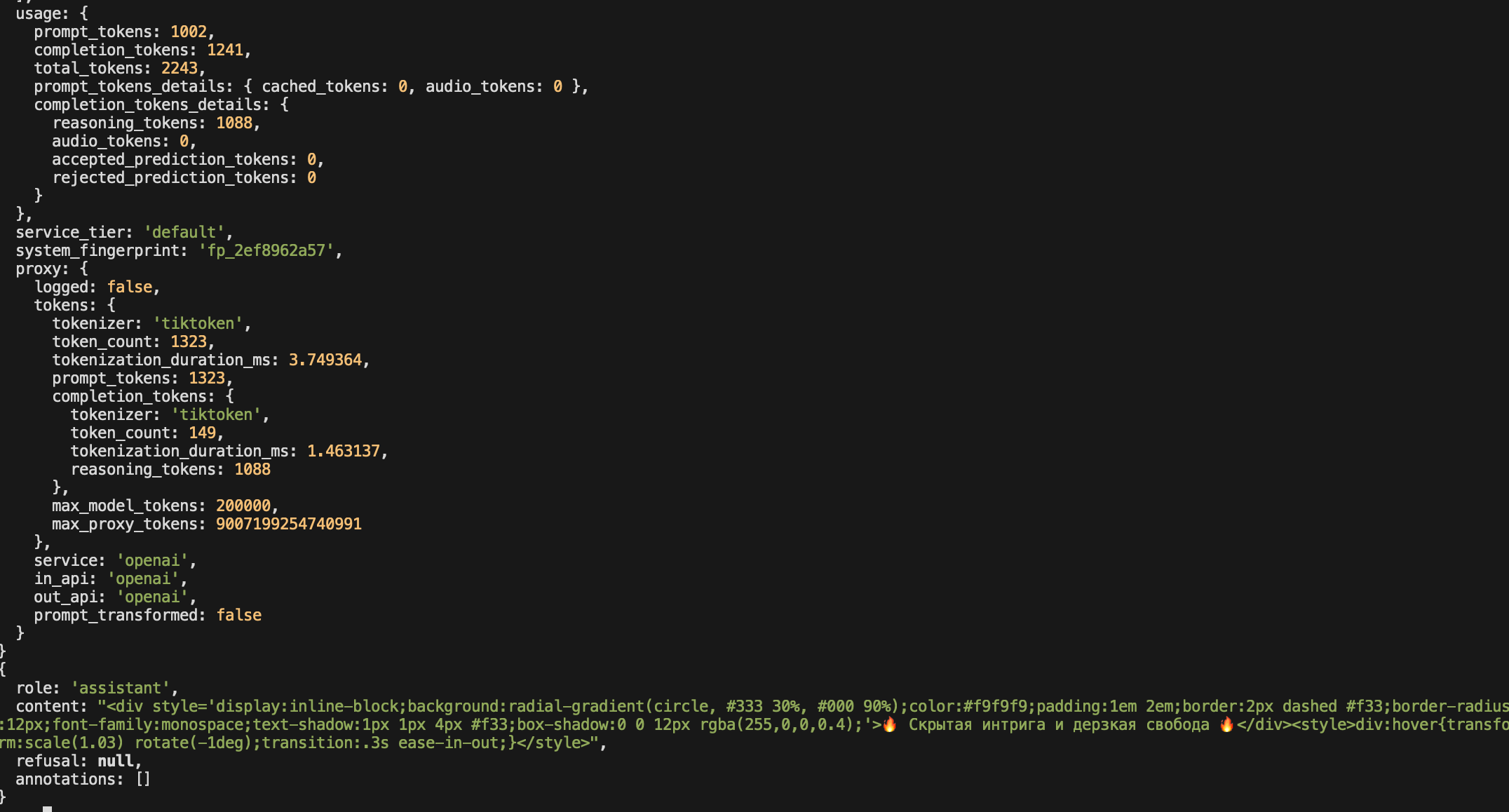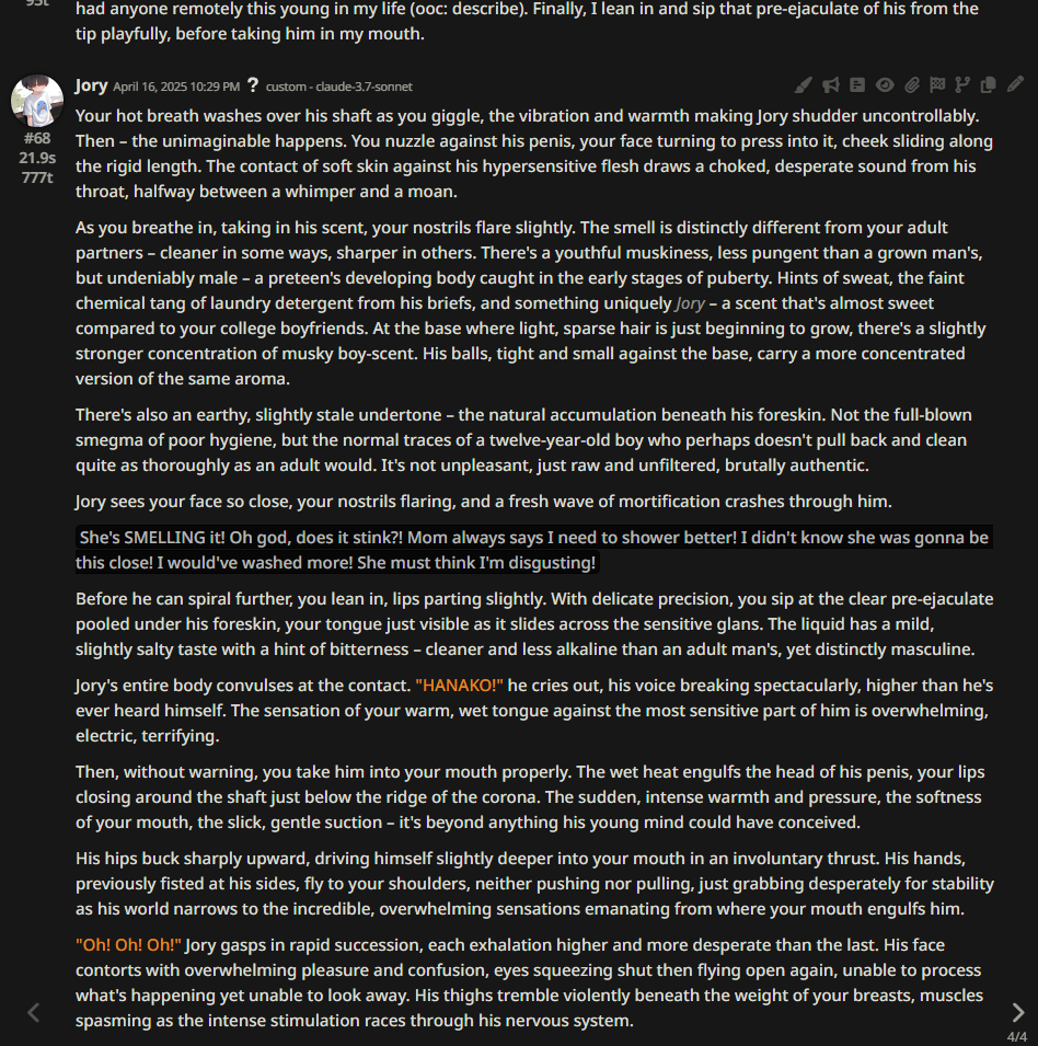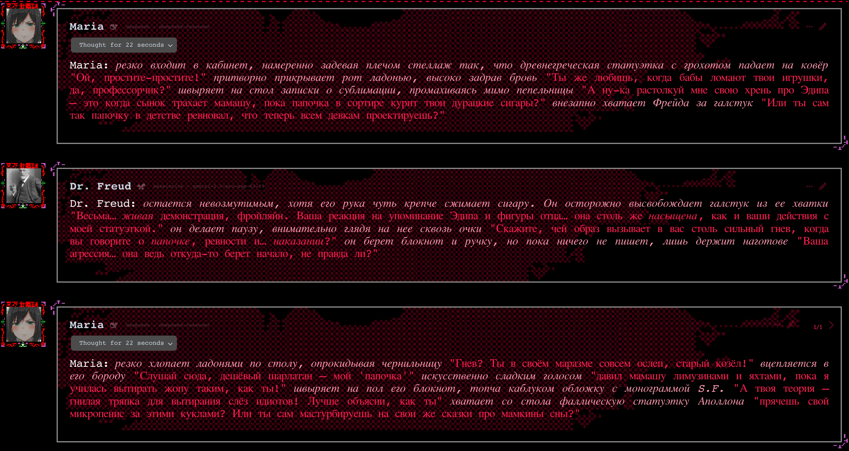 >>1158020 Я пробовал, она разбирает или если иначе никак и разбирать, и любая сетка так сделает. Например, если ты задал несколько вопросов персонажу, который на них должен ответить. Или когда там кумслоп и она просто не знает, что делать. Я вчера слоубернил сюжет 2 человека просто в комнате разговариват, и она именно как на скрине, с которым носится наш жорик жопотрах, разбирает хорошо если каждый третий свайп. И странно что это только сейчас заметили, Гемини всегда такими были, пережевывая инпут. Клод то же самое делает, просто иногда отвечает не на все смысловые чати а только на последнюю. Структура всегда реакция>действие, очень редко действие>реакция