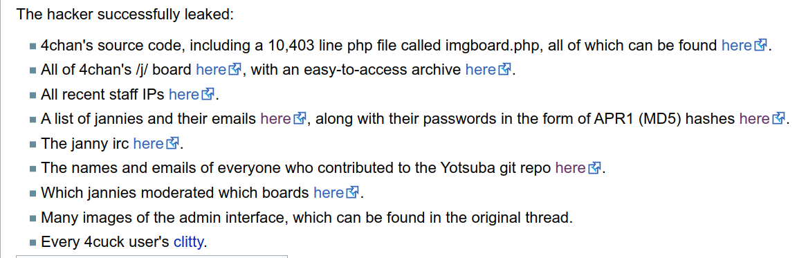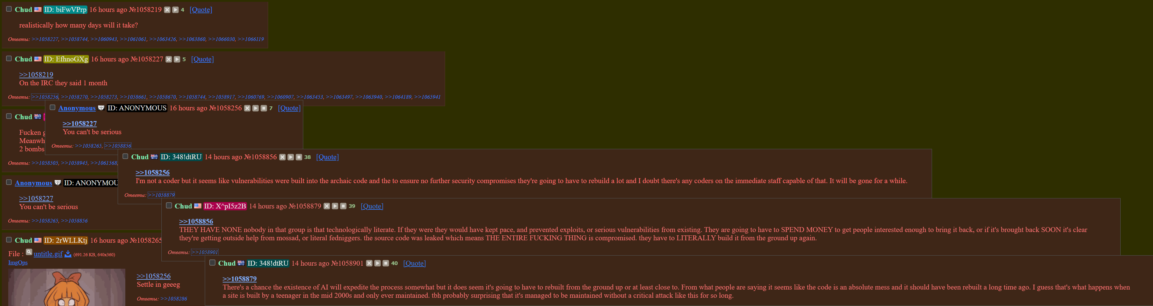 >>1158502 Еблан, базу как раз-то и не слили, уёбище, почитал бы https://wiki.soyjak.st/Great_Cuckset и оригинальный тред >4chan на движке с открытым кодом работает. С огромным кол-вом изменений