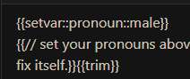 >>1158762 Или вариант ещё лучше и проще чтобы не ебаться так с этими всеми названиями - сделать функцию типа userpronoun("he") и чтобы функция потом меняла he на нужный вариант, а в тексте было проще писать а не думать какой там тип местоимения