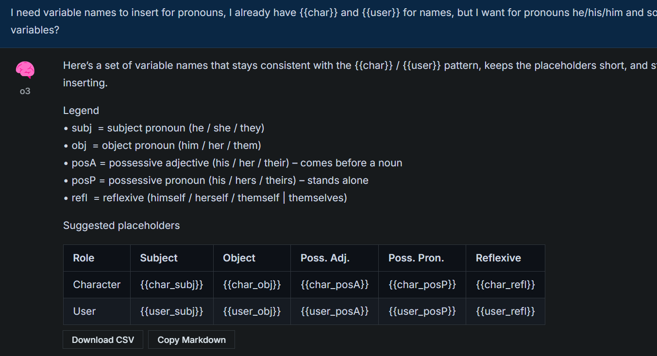 >>1158784 Ещё раз, проблема в том, что персоны разных полов могут быть, и челы в карточках часто пишут отношения персонажей к {{user}}. Чтобы не использовать транс говно типа they, лучше бы было юзать норм местоимения, но если юзать только he/him то для женских карточек (фемпов) придётся переписывать карточку