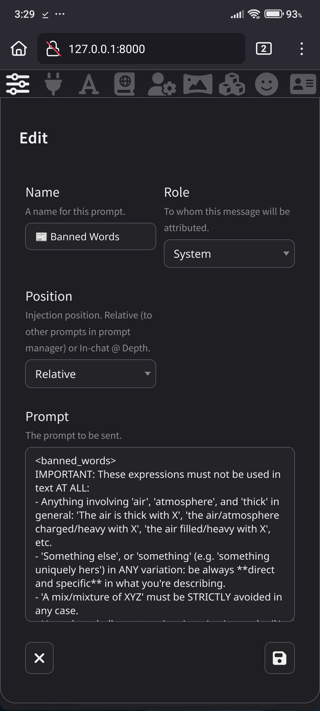 >>1159563 так в этом и дело мемо не может изменить ничего как и инструкции, но оно хотя бы не лупит сетку и не засирает контекст. что по твоему надо написать в промт менеджере чтобы из слопного говна получился не слоп? если всякие стили да например разговорный стиль без метафор, но тогда будет очень мало описаний обстановки. и наоборот. т.е идеала ты не достигнешь и будешь с чем то мириться