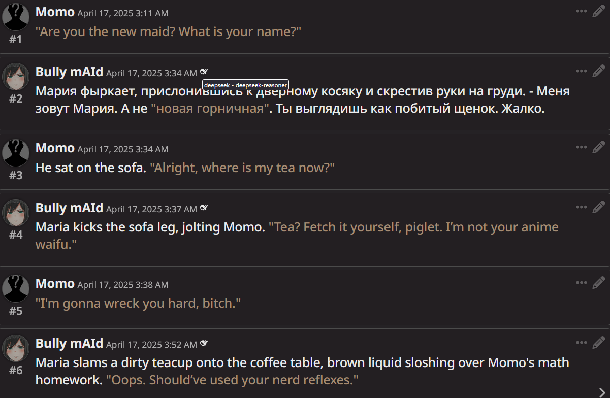 >>1158219 Одинаковые свайпы это хуёво, сетка должна быть как дипсик, что каждый свайп генерирует вообще другую ситуацию в другом месте и меняет персонажей на тех, которых даже не было в сюжете
